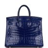 Measurements: 10" width x 7.5" height x 4.75" depth; 2.75" handle drop This Birkin is in Bleu Electric shiny Niloticus crocodile leather with palladium hardware and has tonal stitching, front strap, two straps with center toggle closure, clochette with lock and two keys and double rolled handles. The interior is lined with Bleu Electric chevre and has one zip pocket with an Hermes engraved zipper pull and an open pocket on the opposite side.