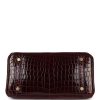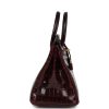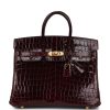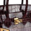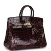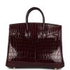 This Birkin is in Bordeaux Shiny Niloticus Crocodile leather with gold hardware, tonal stitching, front flap with two straps, front toggle closure, clochette with lock and two keys, and double rolled handles.