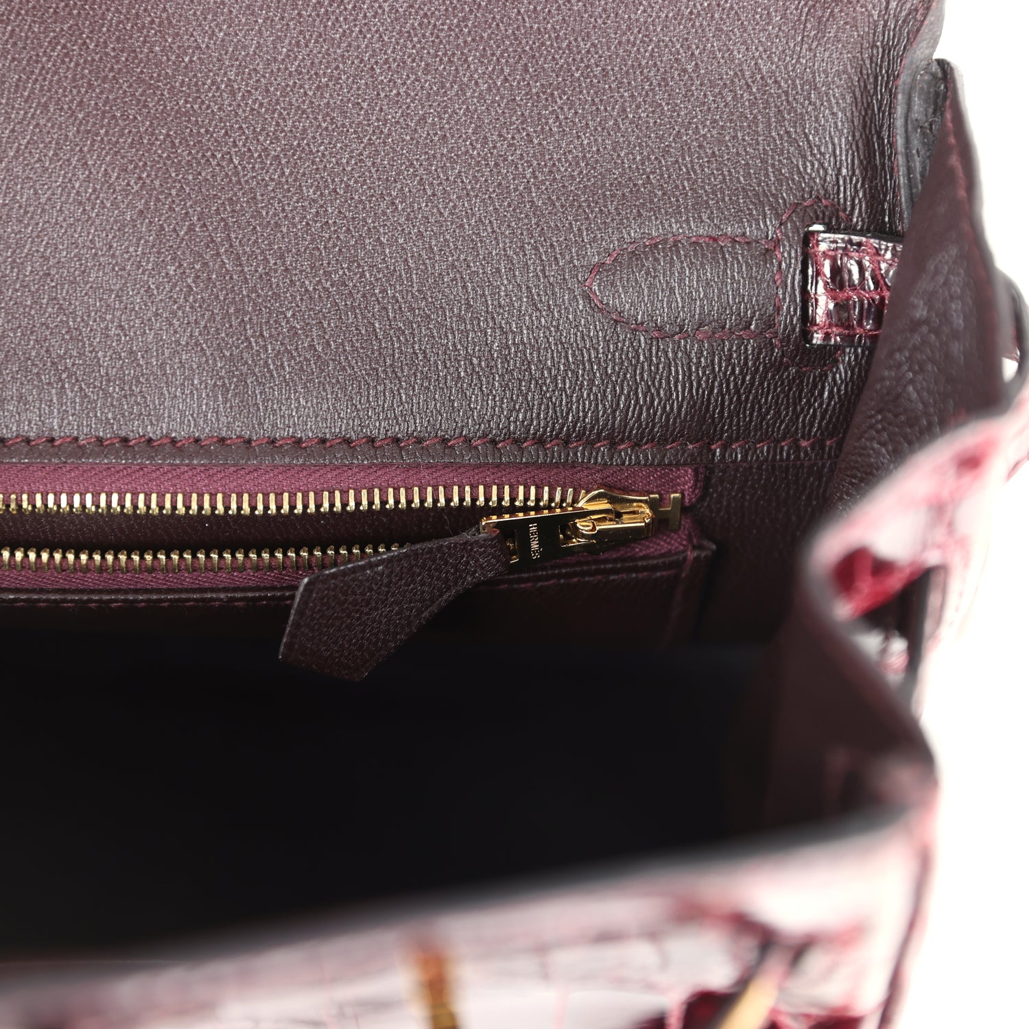 This Birkin is in Bordeaux Shiny Niloticus Crocodile leather with gold hardware, tonal stitching, front flap with two straps, front toggle closure, clochette with lock and two keys, and double rolled handles.