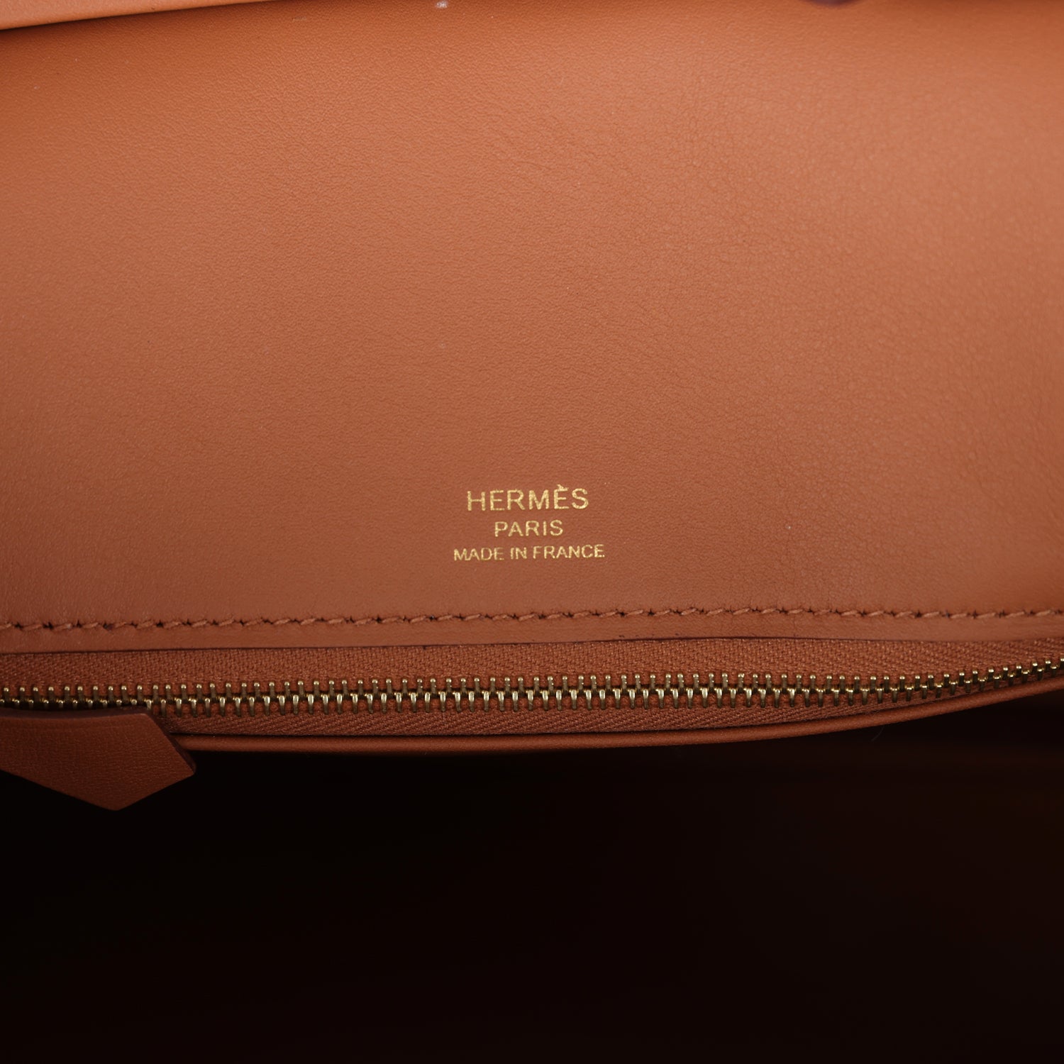 The interior is lined with Gold swift leather and has one zip pocket with an Hermès engraved zipper pull and an open pocket on the opposite side.