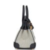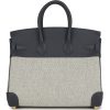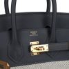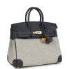 This Birkin is in Ecru and Ardoise Toile H canvas and Ardoise swift leather with gold hardware and has tonal stitching, front flap, two straps with center toggle closure, clochette with lock and two keys, and double rolled handles.
