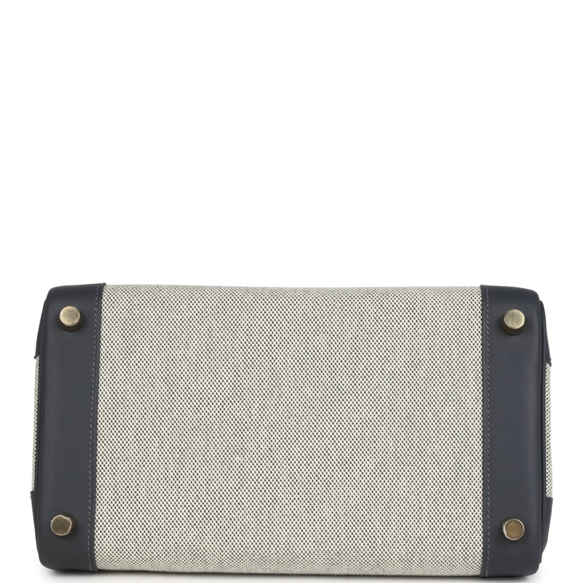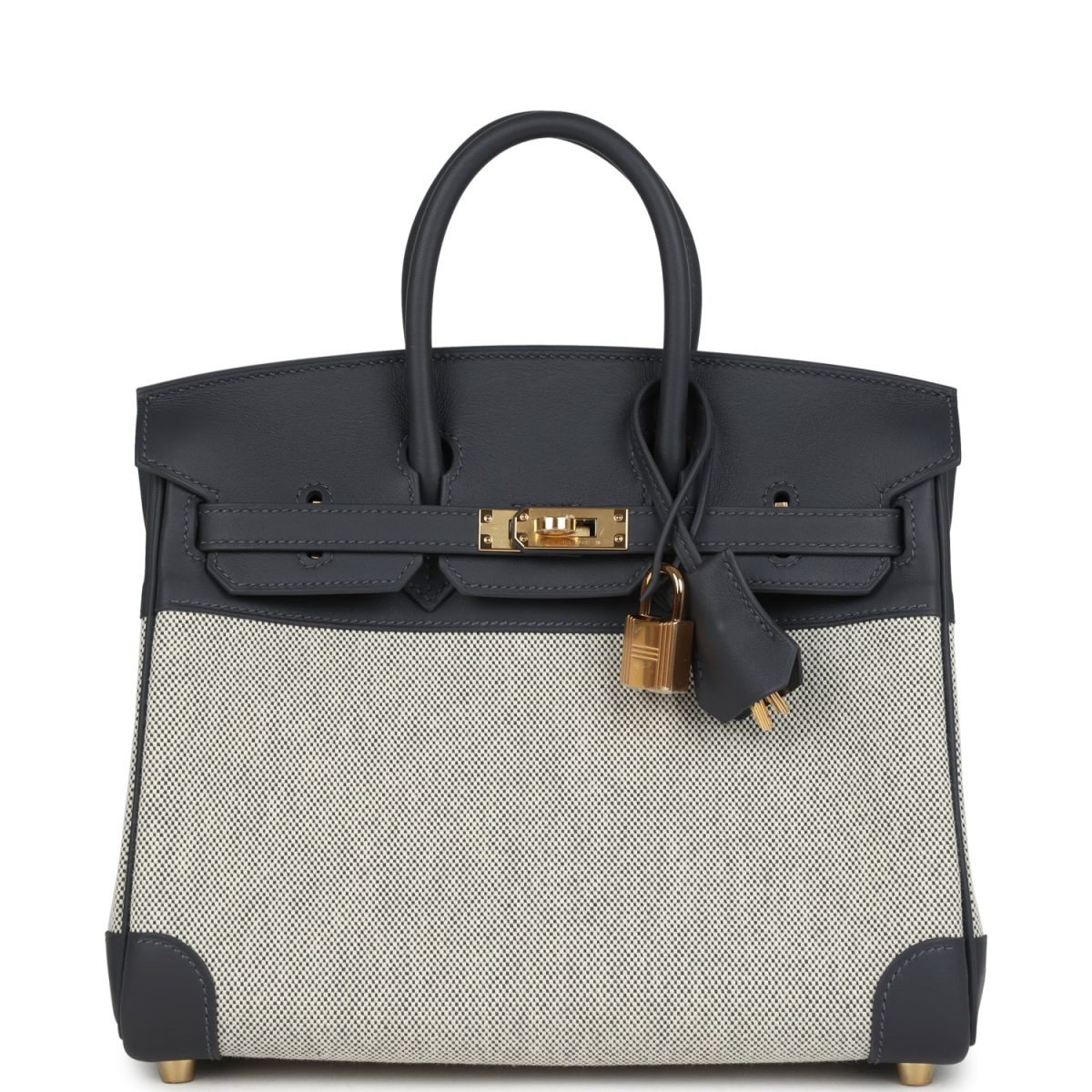 This Birkin is in Ecru and Ardoise Toile H canvas and Ardoise swift leather with gold hardware and has tonal stitching, front flap, two straps with center toggle closure, clochette with lock and two keys, and double rolled handles.