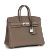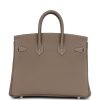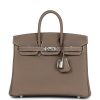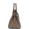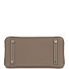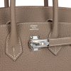 This Birkin is in Etoupe togo leather with palladium hardware and has contrast stitching, front flap, two straps with center toggle closure, clochette with lock and two keys, and double rolled handles.
