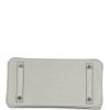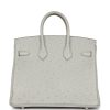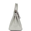 This Birkin is in Gris Perle ostrich leather with palladium hardware, tonal stitching, front flap with two straps, front toggle closure, clochette with lock and two keys, and double rolled handles.
