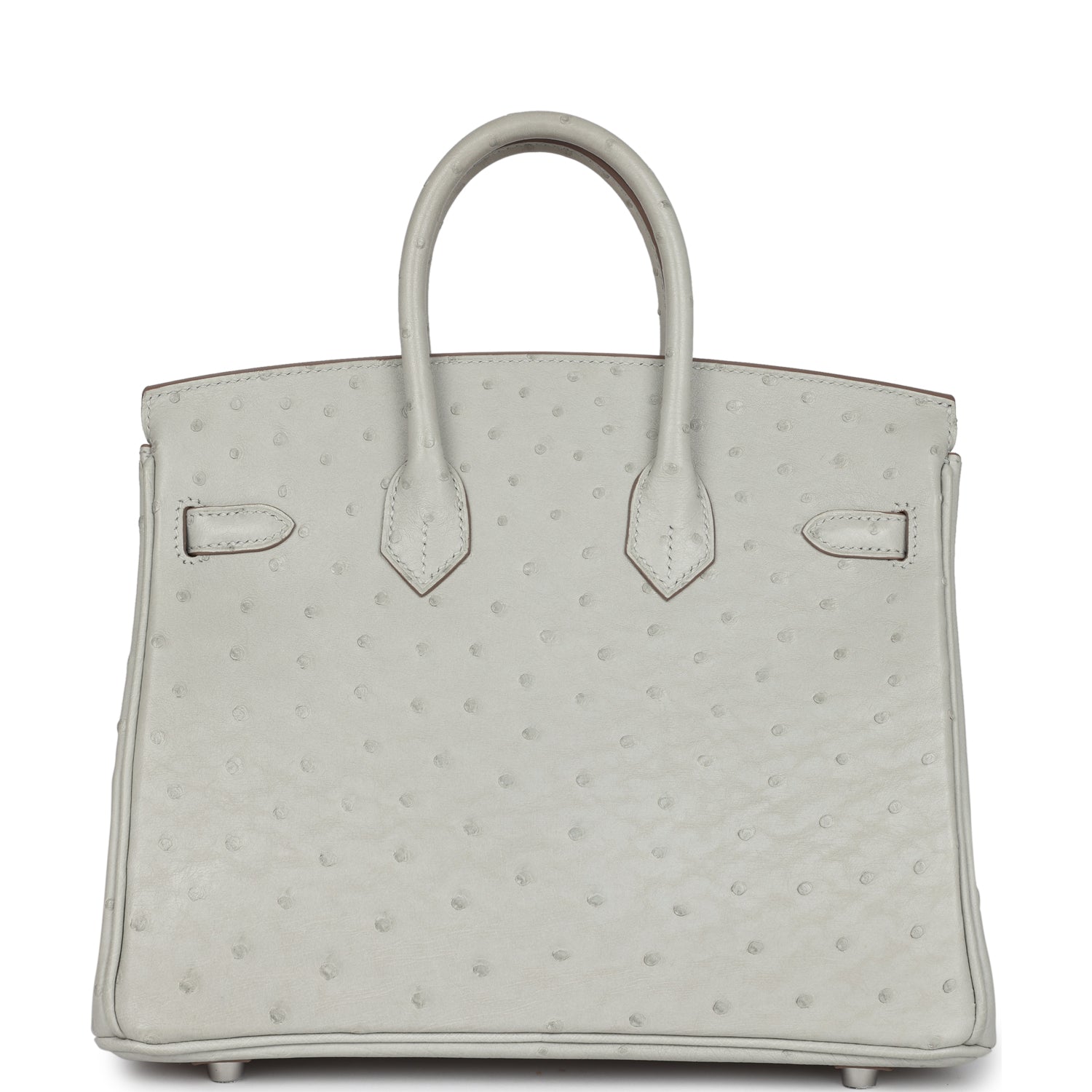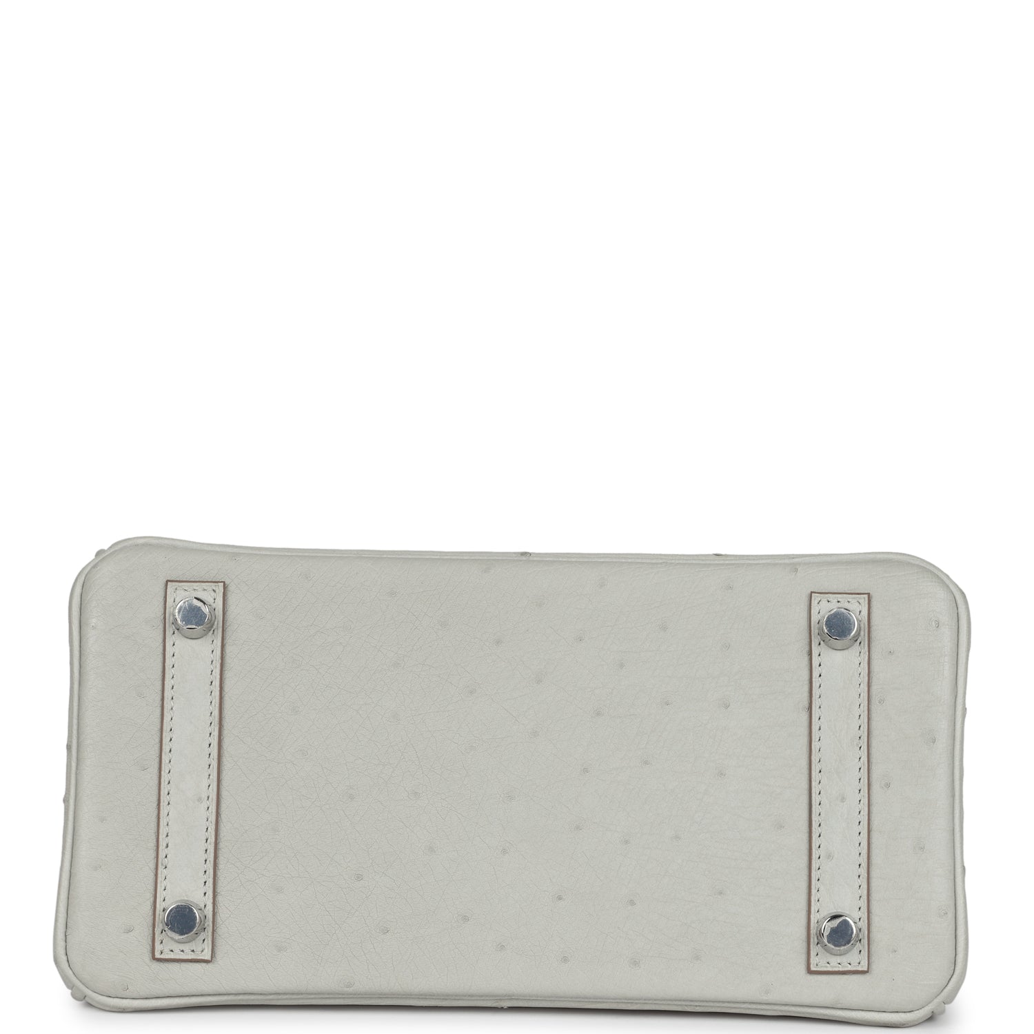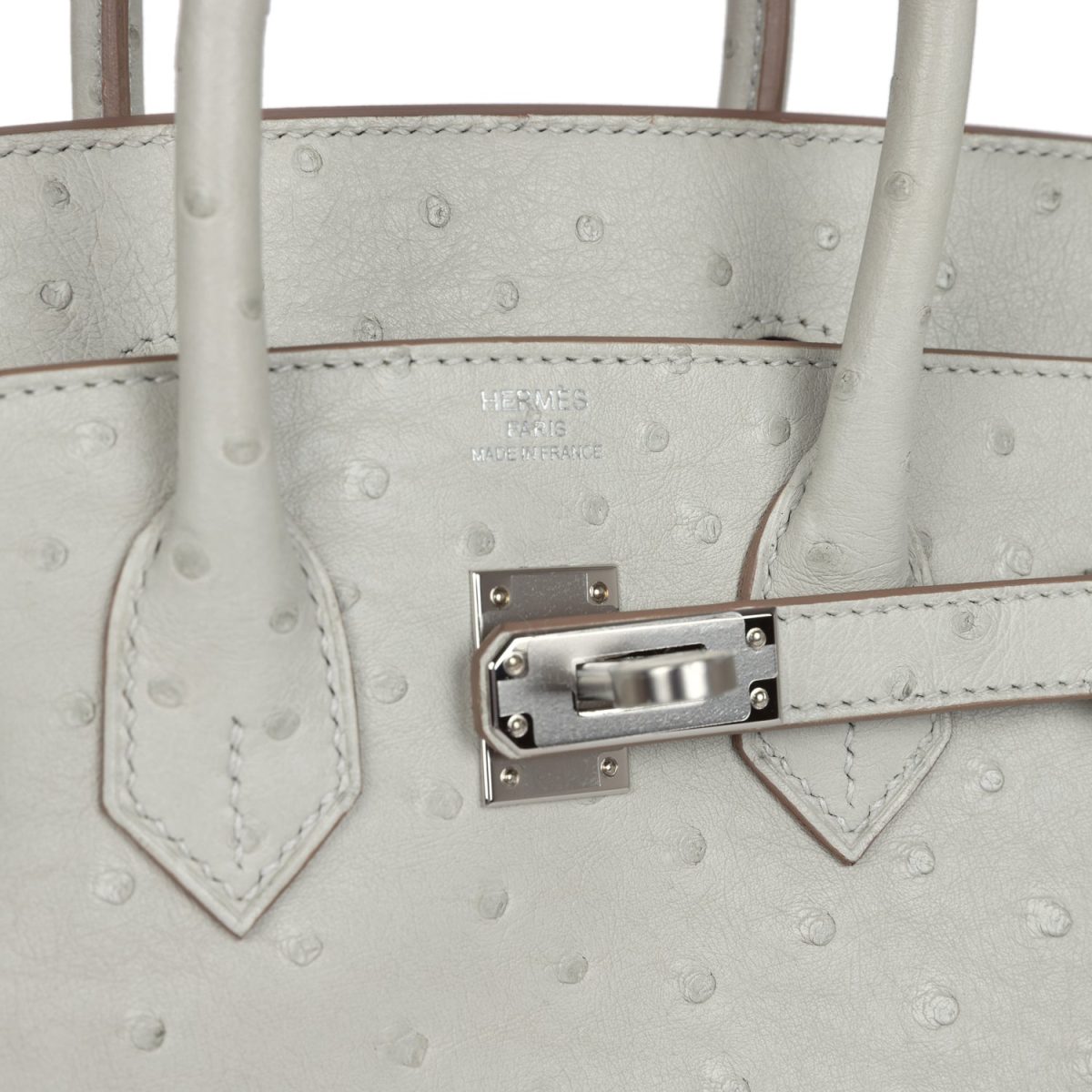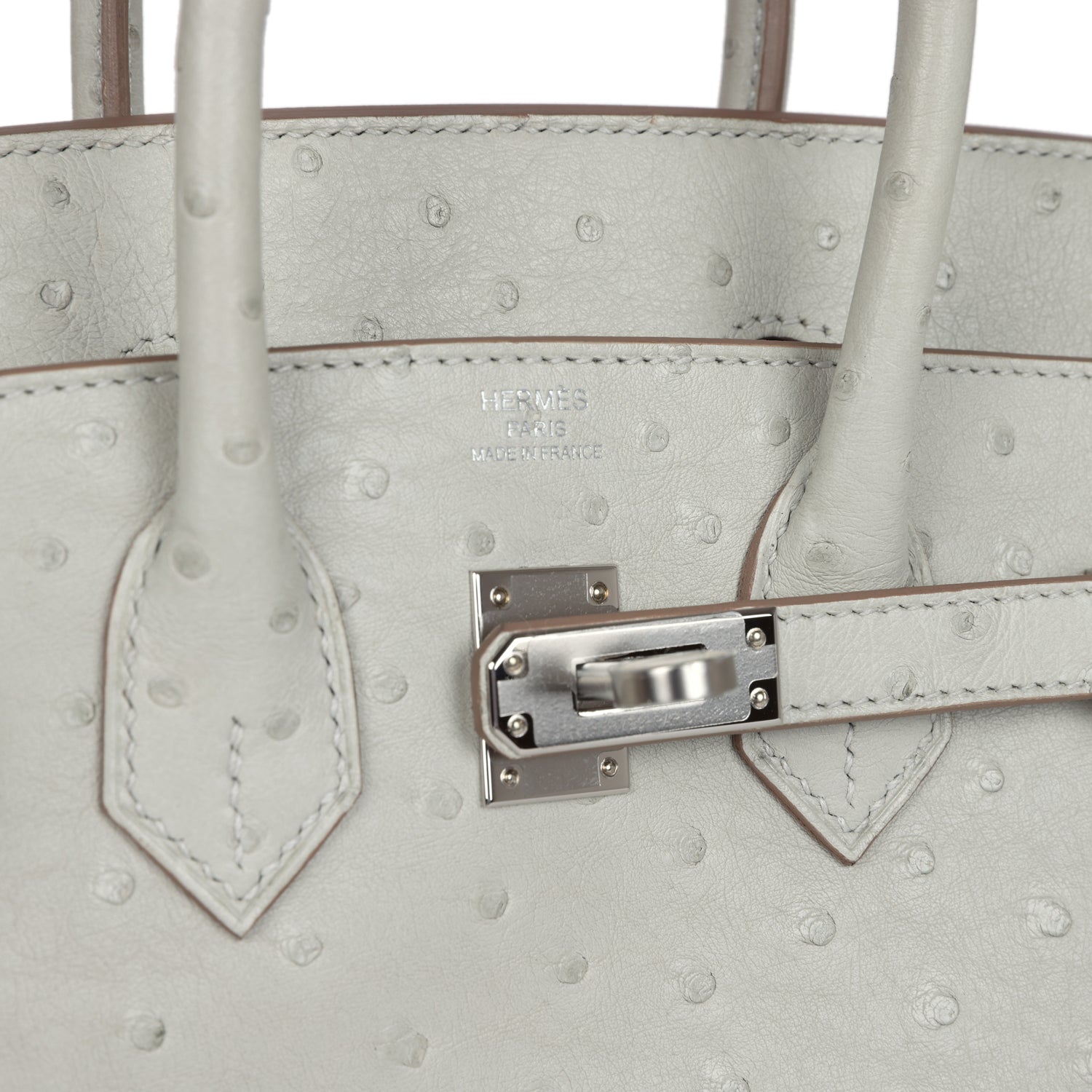 This Birkin is in Gris Perle ostrich leather with palladium hardware, tonal stitching, front flap with two straps, front toggle closure, clochette with lock and two keys, and double rolled handles.