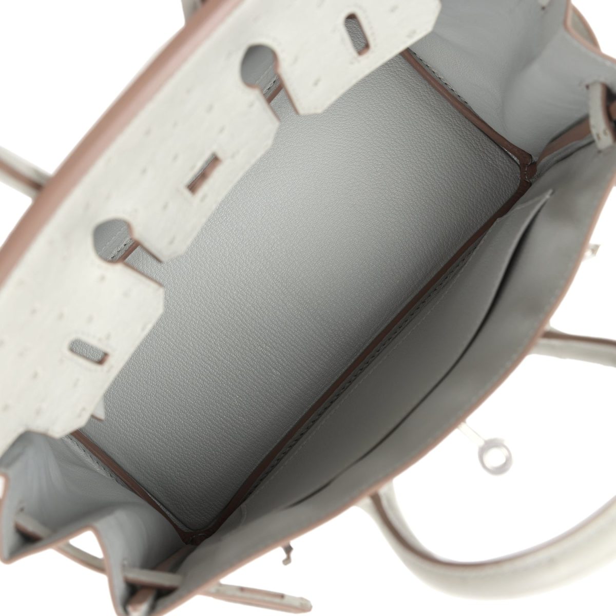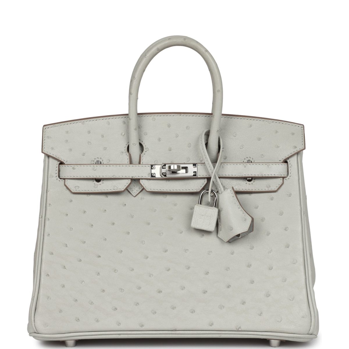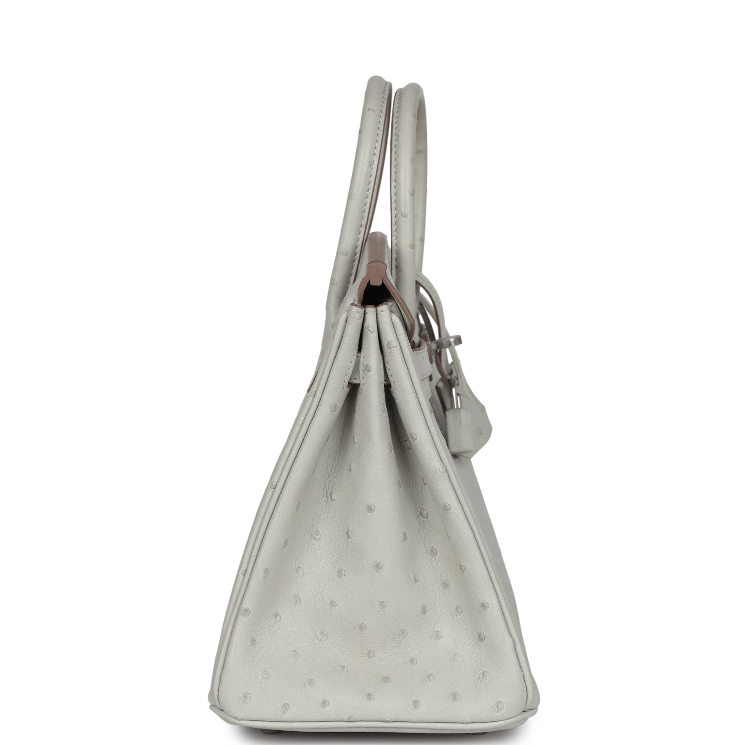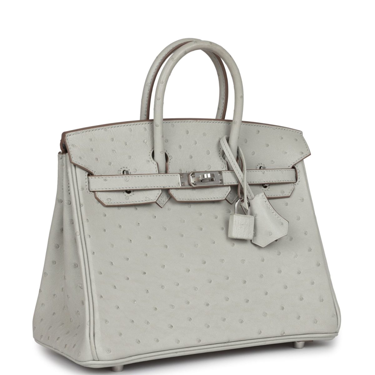 This Birkin is in Gris Perle ostrich leather with palladium hardware, tonal stitching, front flap with two straps, front toggle closure, clochette with lock and two keys, and double rolled handles.