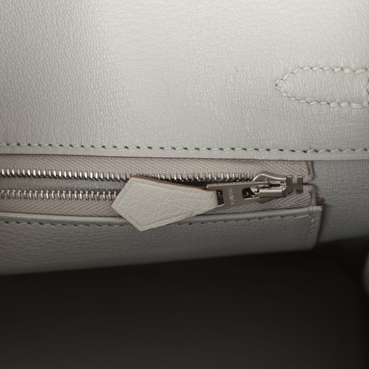 The interior is lined with Gris Perle chevre leather and has one zip pocket with an Hermès engraved zipper pull and an open pocket on the opposite side.