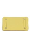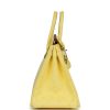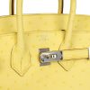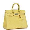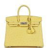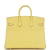 This Birkin 25 is in Jaune Citron ostrich leather with palladium hardware and has tonal stitching, front strap, two straps with center toggle closure, clochette with lock and two keys and double rolled handles.
