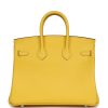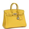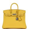This Birkin is in Jaune de Naples swift leather with palladium hardware and has tonal stitching, front flap, two straps with center toggle closure, clochette with lock and two keys, and double rolled handles.