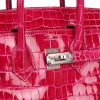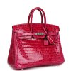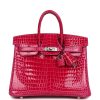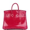 This Birkin is in Rose Mexico shiny Porosus crocodile leather with palladium hardware and has tonal stitching, front strap, two straps with center toggle closure, clochette with lock and two keys and double rolled handles.