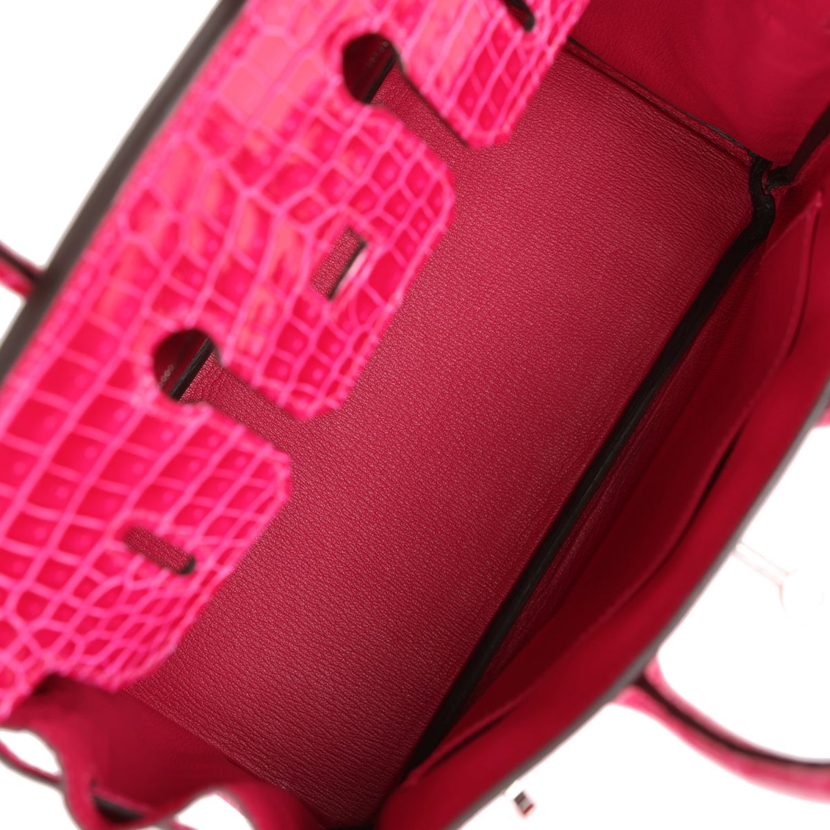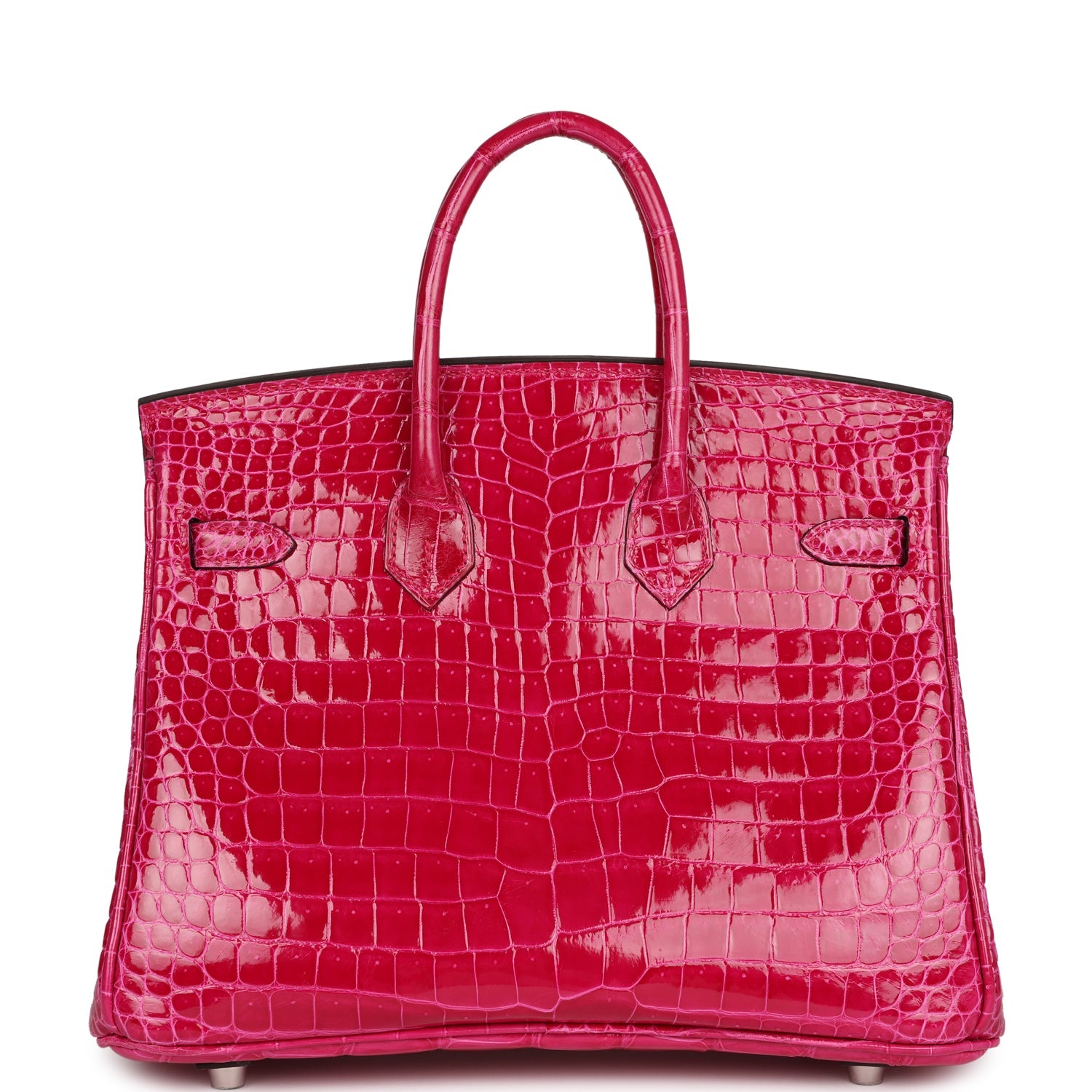 This Birkin is in Rose Mexico shiny Porosus crocodile leather with palladium hardware and has tonal stitching, front strap, two straps with center toggle closure, clochette with lock and two keys and double rolled handles.
