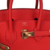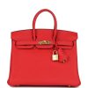 This Birkin is in Rouge De Coeur togo leather with gold hardware and has tonal stitching, two straps with front toggle closure, clochette with lock and two keys and double rolled handles.