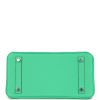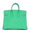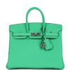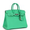 This Birkin 25 is in Vert Comics Togo with palladium hardware, tonal stitching, front flap with two straps, front toggle closure, clochette with lock and two keys, and double rolled handles.