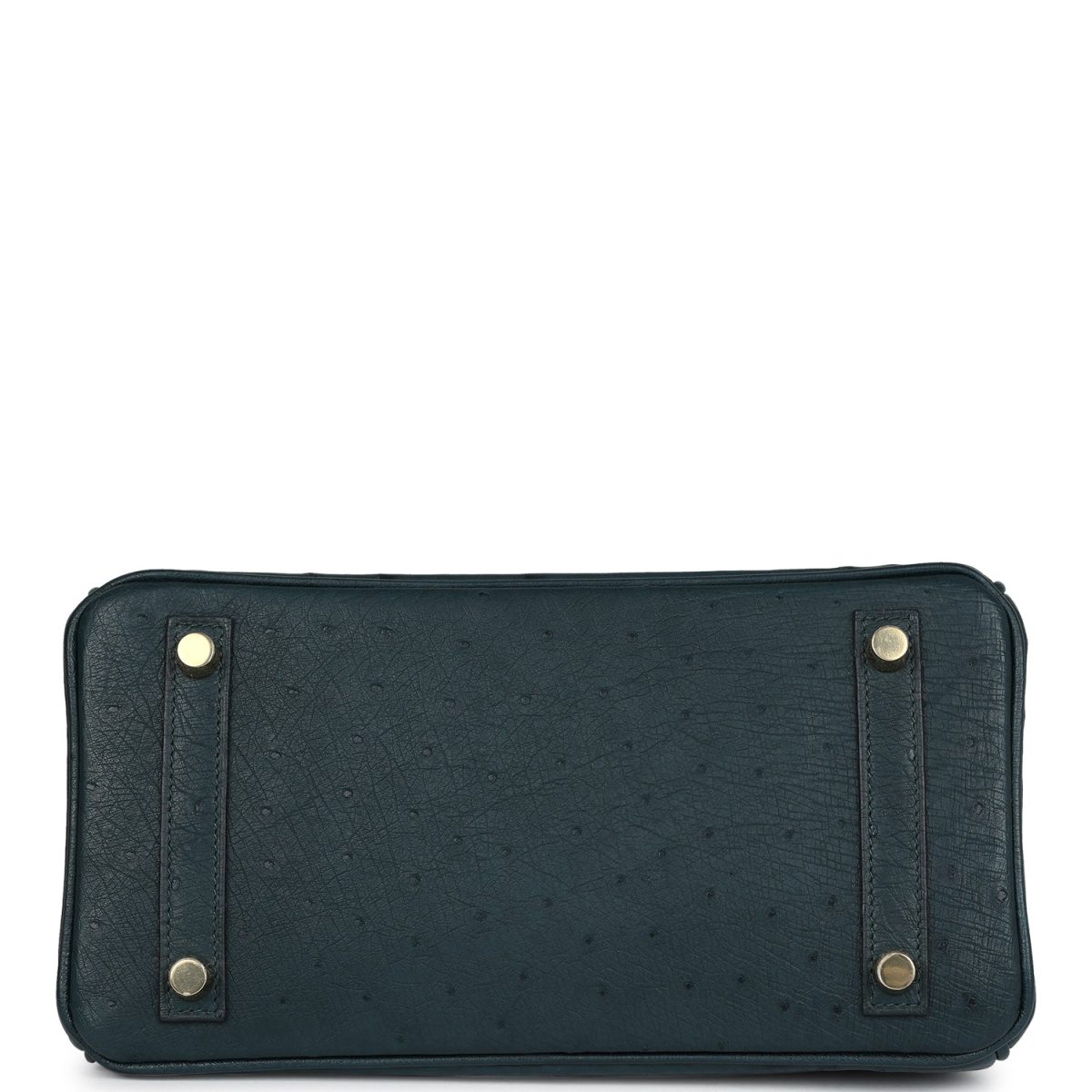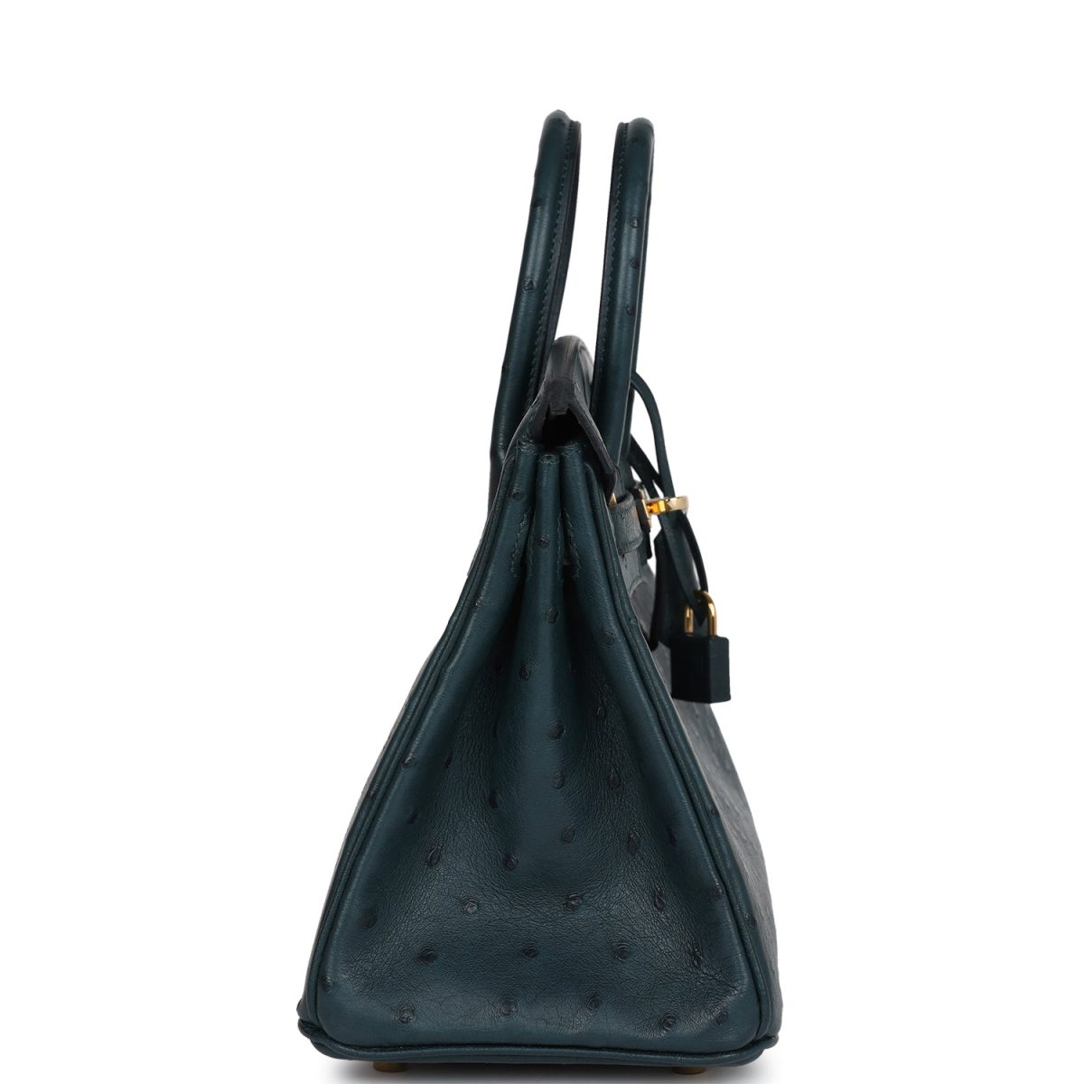 This Birkin is in Vert Cypres ostrich with gold hardware and features tonal stitching, front flap, two straps with center toggle closure, clochette with lock and two keys, and double rolled handles.