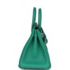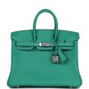 This Birkin is in Vert Vertigo and Bleu Celeste swift leather with palladium hardware and has tonal stitching, front flap, two straps with center toggle closure, clochette with lock and two keys, and double rolled handles.