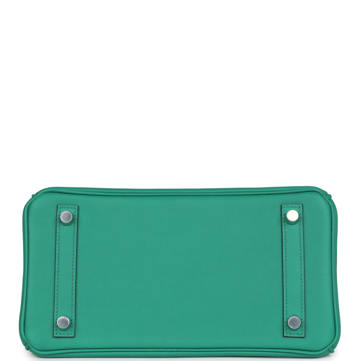 This Birkin is in Vert Vertigo and Bleu Celeste swift leather with palladium hardware and has tonal stitching, front flap, two straps with center toggle closure, clochette with lock and two keys, and double rolled handles.