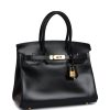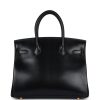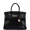 This Birkin is in Black boxcalf leather with gold hardware and has tonal stitching, front flap, two straps with center toggle closure, clochette with lock and two keys, and double rolled handles.