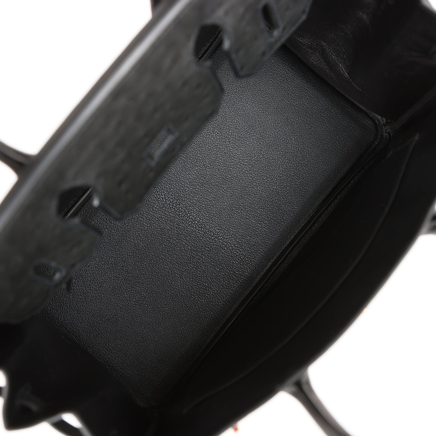 Measurements: 11.75" width x 9" height x 6.5" depth; 4.25" handle drop This Birkin is in black ostrich with rose gold hardware and features tonal stitching, front flap, two straps with center toggle closure, clochette with lock and two keys, and double rolled handles. The interior is lined with black chevre and has a zip pocket with an Hermès engraved zipper pull and an open pocket on the opposite side.