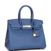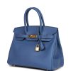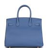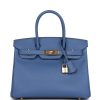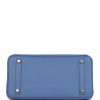 This Birkin is in Bleu Brighton epsom leather with gold hardware and has tonal stitching, front flap, two straps with center toggle closure, clochette with lock and two keys, and double rolled handles.