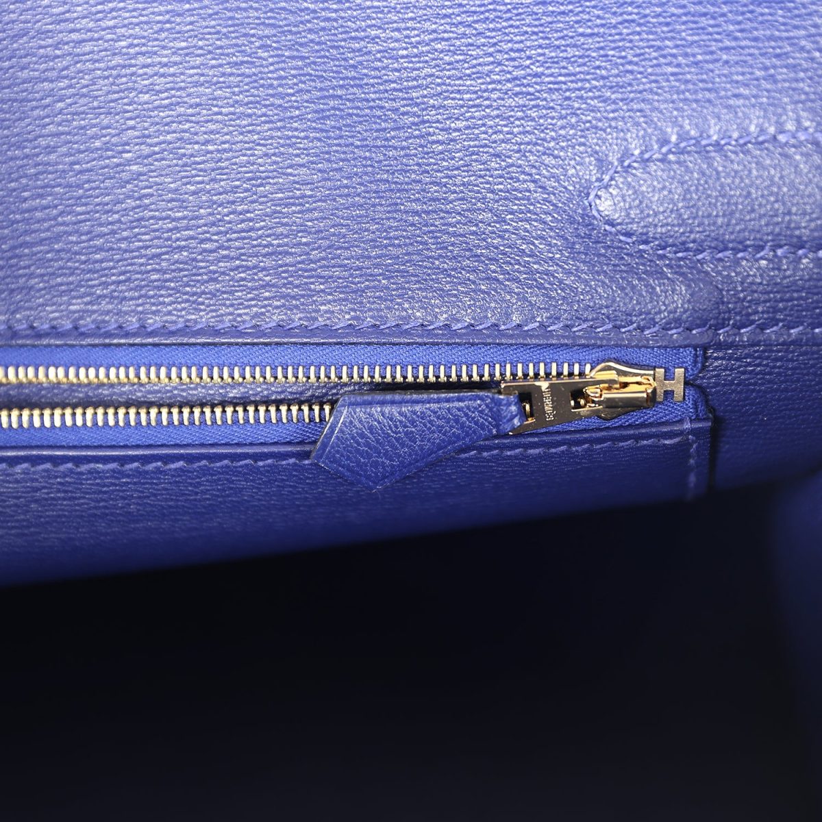 The interior is lined with Bleu Electric chevre and has one zip pocket with an Hermès engraved zipper pull and an open pocket on the opposite side.