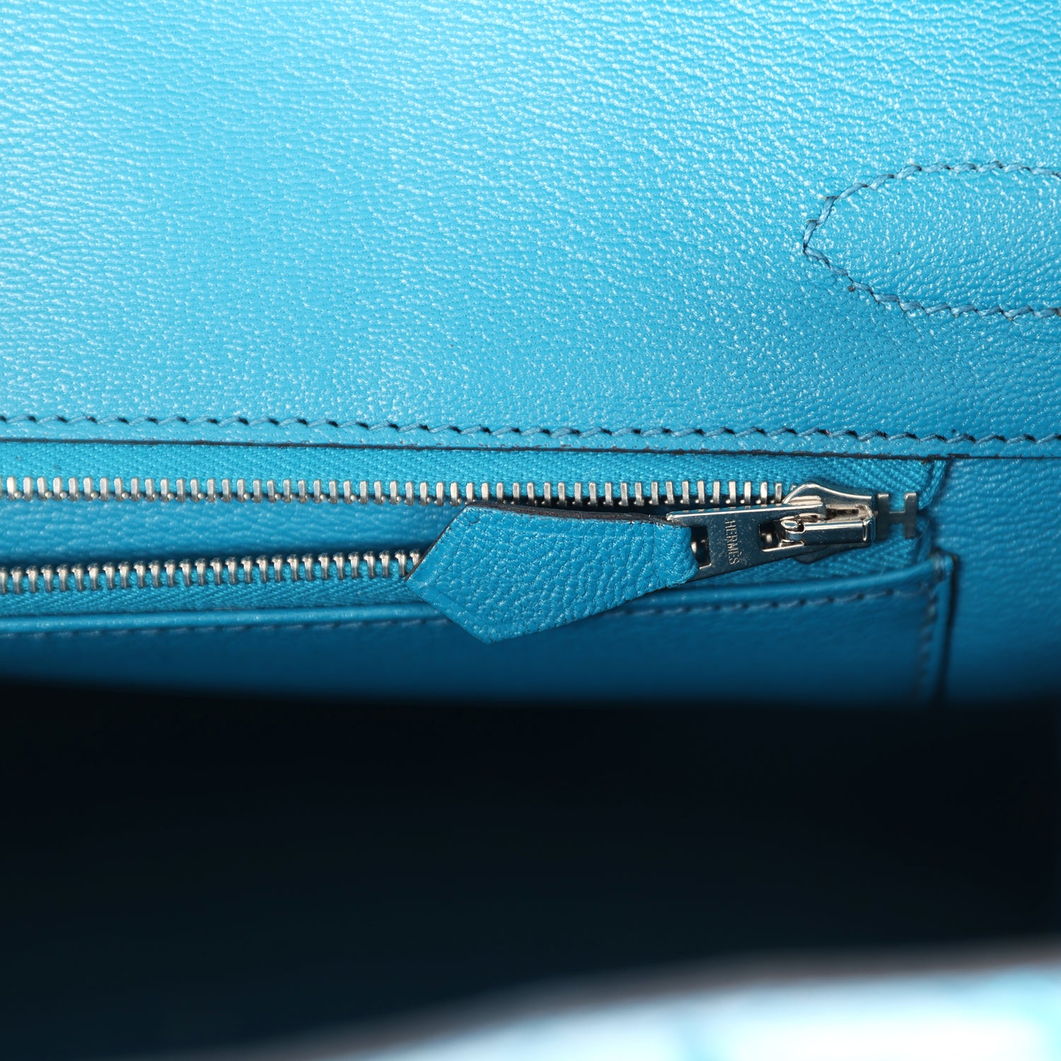 The interior is lined with Bleu Izmir chevre and has one zip pocket with an Hermès engraved zipper pull and an open pocket on the opposite side.