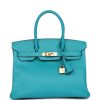 This Hermès Birkin is in Bleu Paon epsom leather with gold hardware, and featuring tonal stitching, front flap with two straps, front toggle closure, clochette with lock and two keys, and double rolled handles.