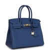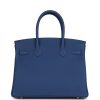 The interior is lined with Bleu Tie chevre and has one zip pocket with an Hermès engraved zipper pull and an open pocket on the opposite side.