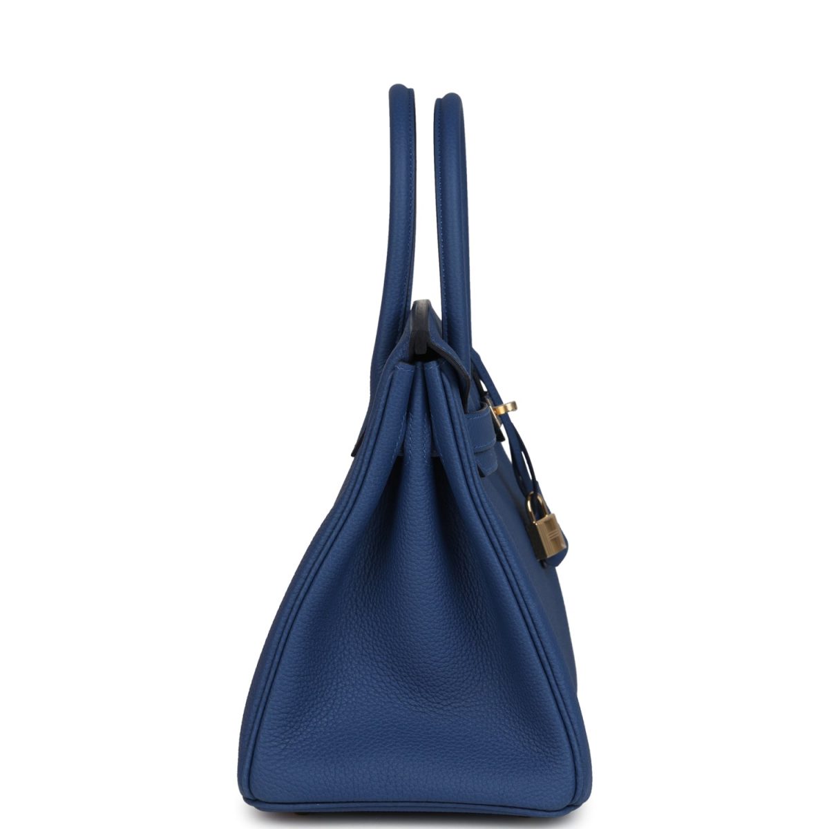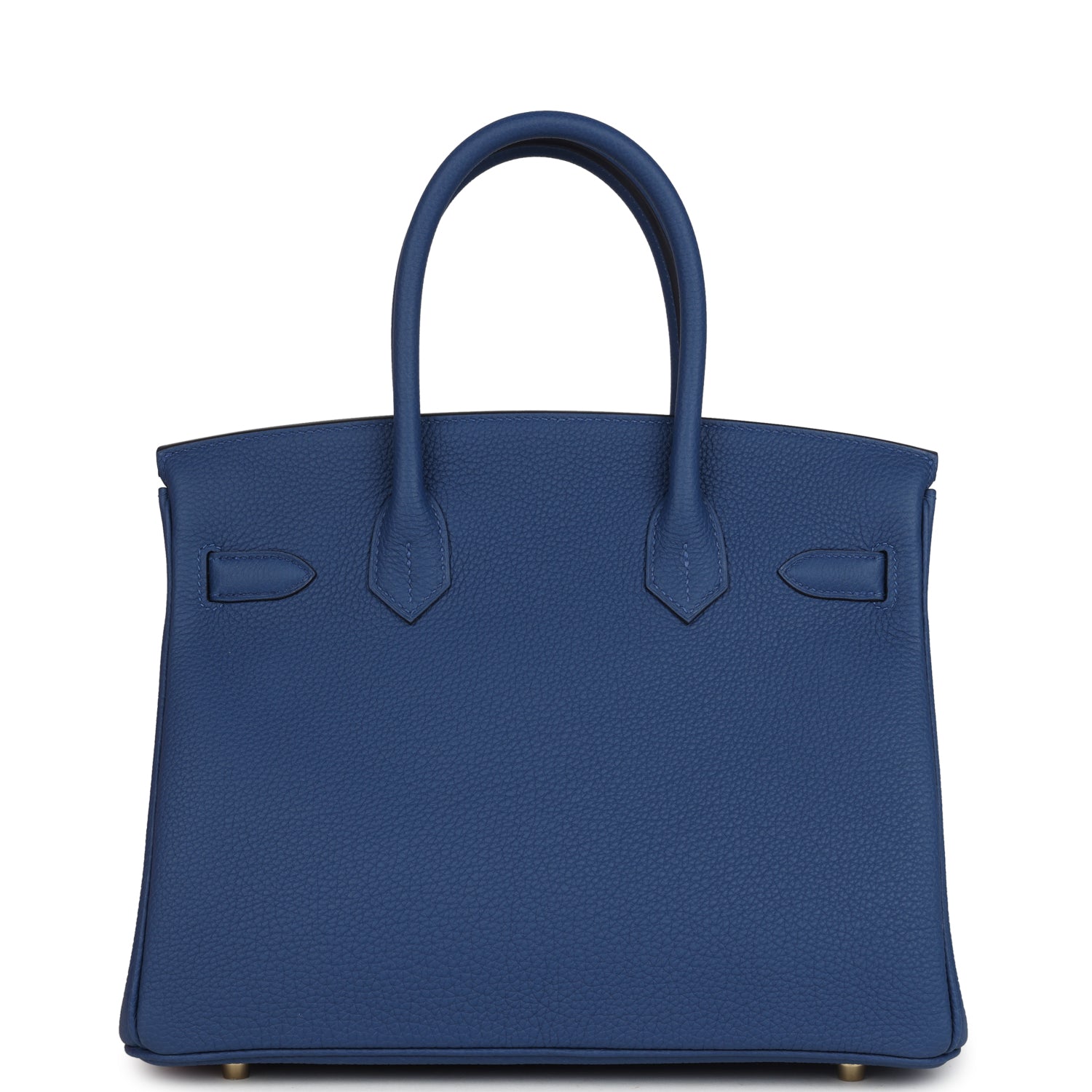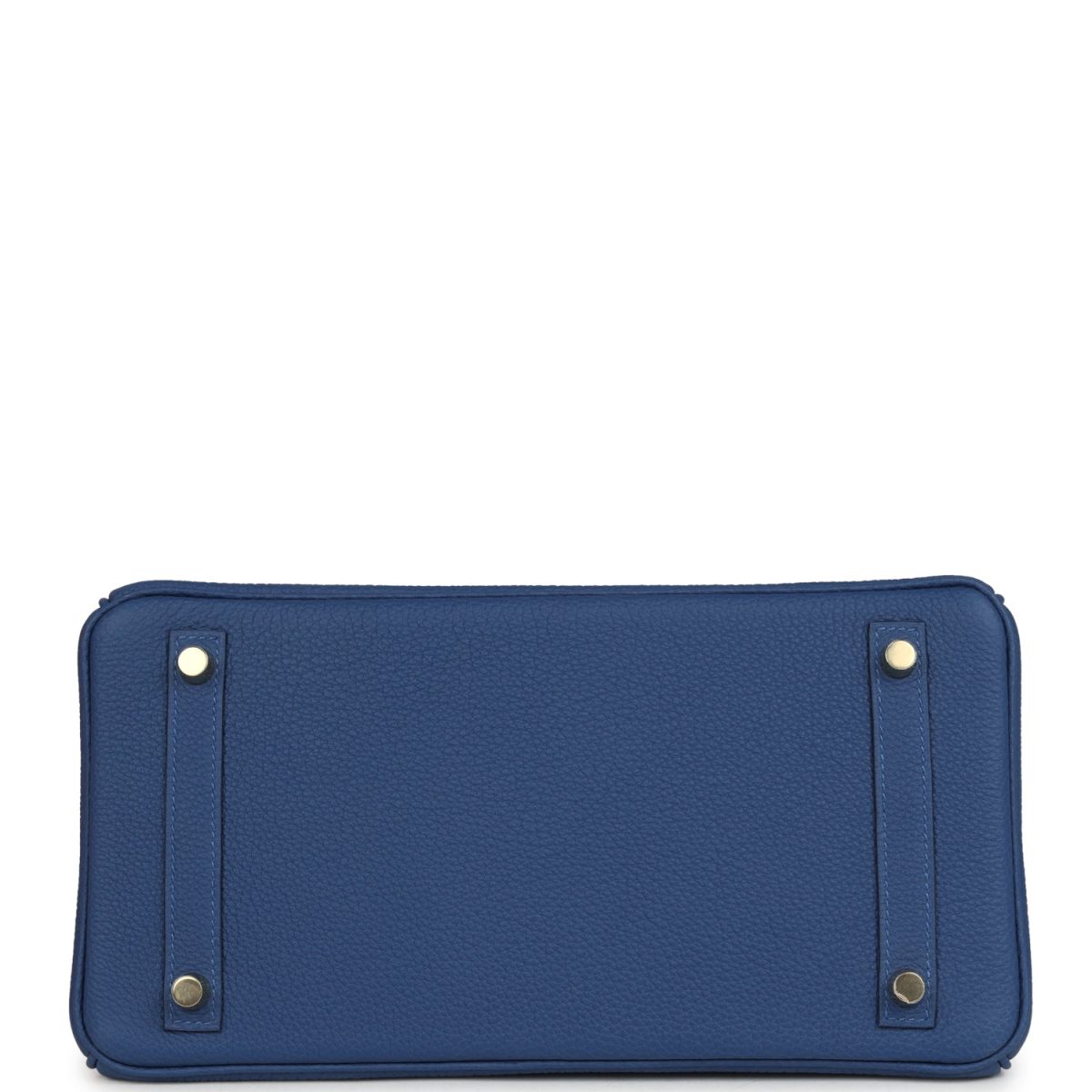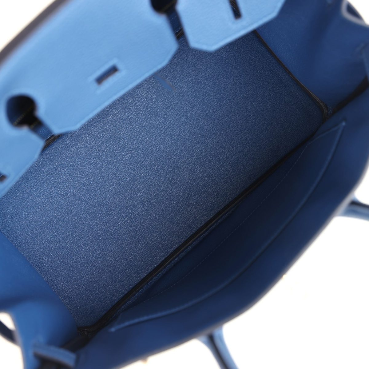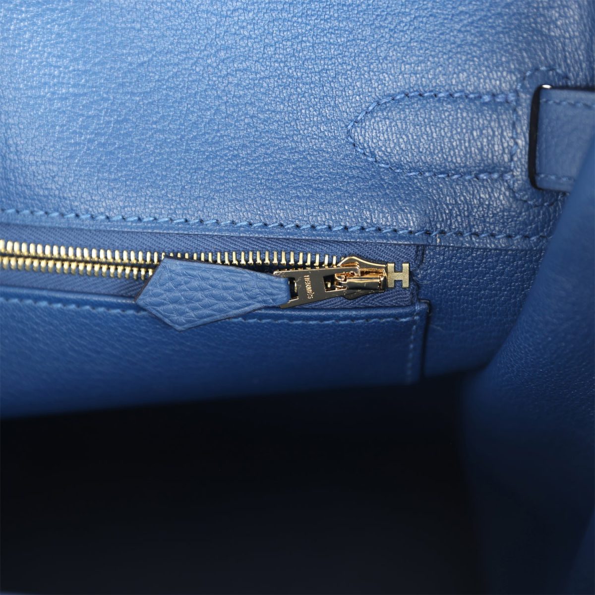 The interior is lined with Bleu Tie chevre and has one zip pocket with an Hermès engraved zipper pull and an open pocket on the opposite side.