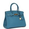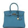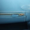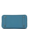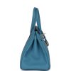 This Birkin is in Blue Jean togo leather with palladium hardware and has white contrast stitching, front flap, two straps with center toggle closure, clochette with lock and two keys, and double rolled handles.