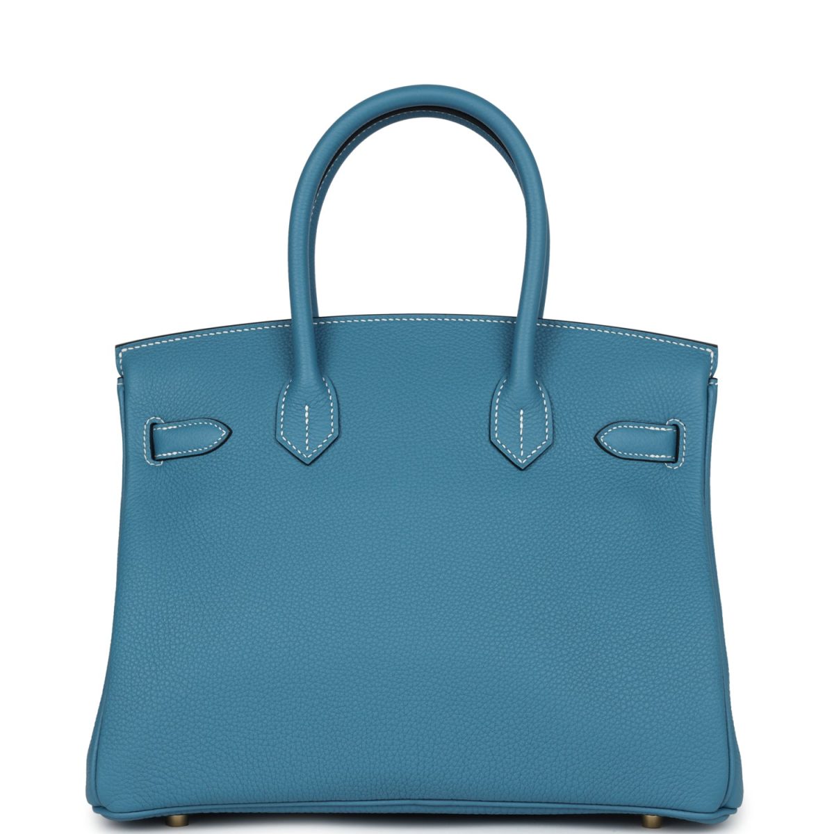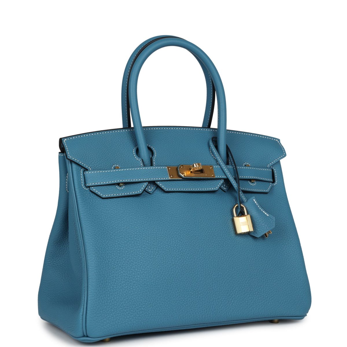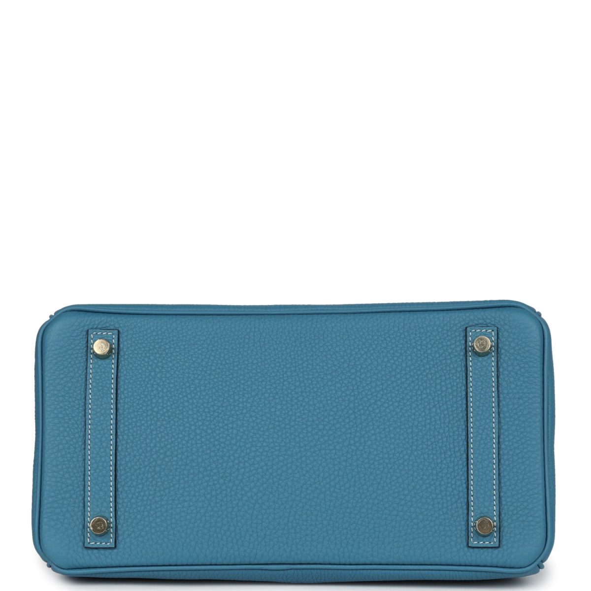 This Birkin is in Blue Jean togo leather with palladium hardware and has white contrast stitching, front flap, two straps with center toggle closure, clochette with lock and two keys, and double rolled handles.