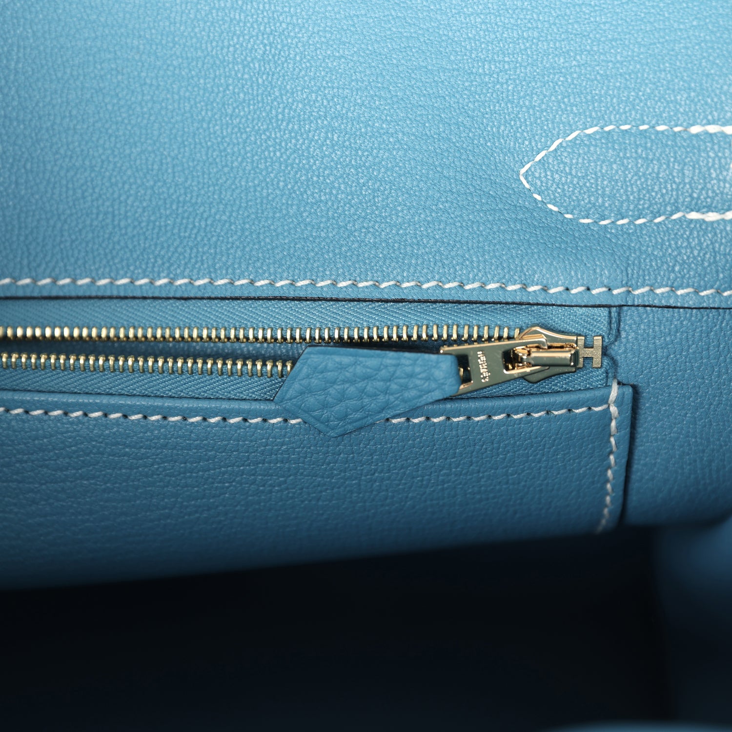 The interior is lined with Blue Jean chevre and has one zip pocket with an Hermès engraved zipper pull and an open pocket on the opposite side.
