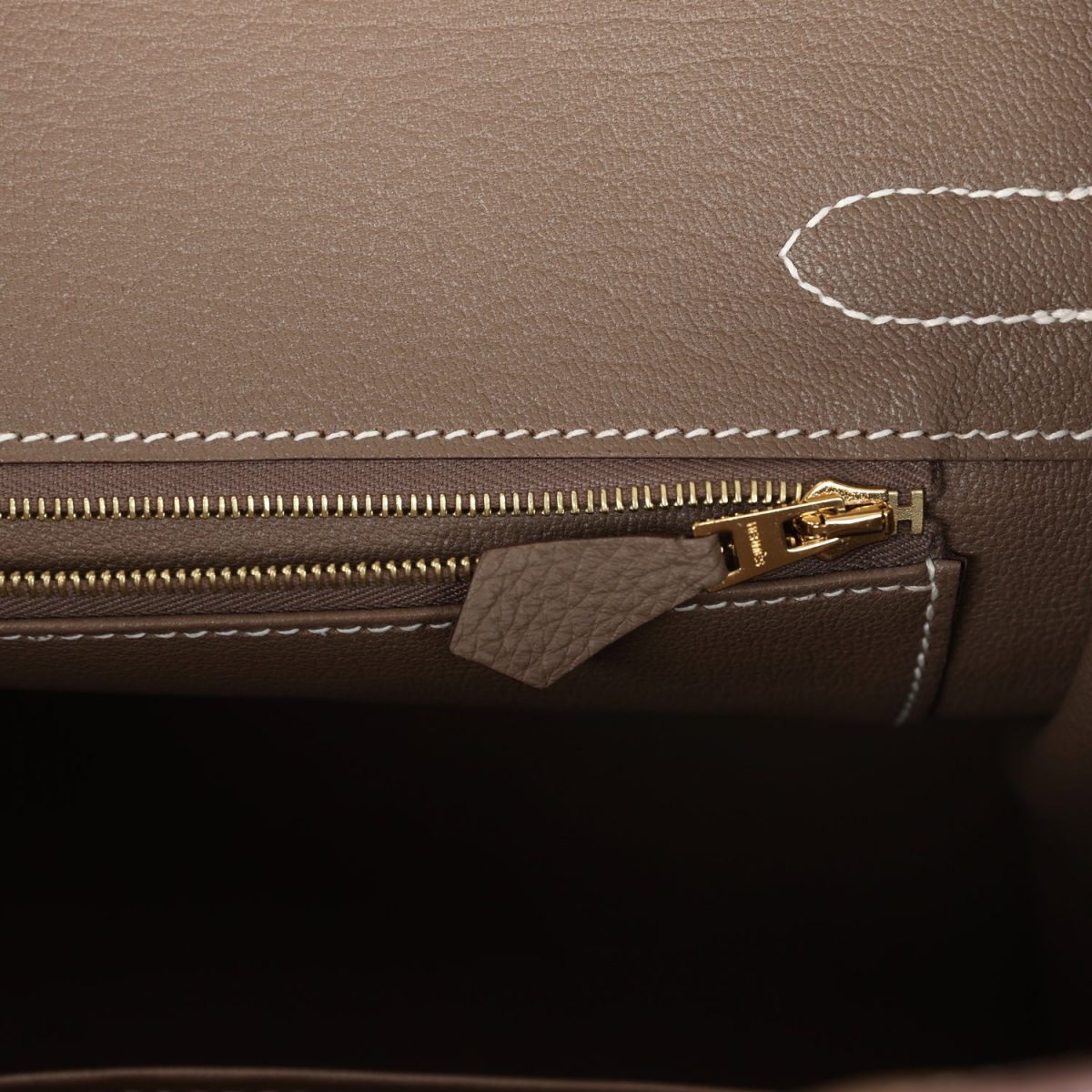 The interior is lined with Etoupe chevre and has one zip pocket with an Hermès engraved zipper pull and an open pocket on the opposite side.