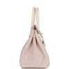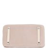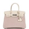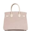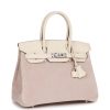 This Birkin is in Glycine grizzly and Nata swift leather with palladium hardware and has tonal stitching, front flap, two straps with center toggle closure, clochette with lock and two keys, and double rolled handles.