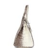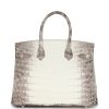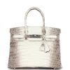 This Himalaya Birkin is in Niloticus crocodile leather with palladium hardware and has contrast stitching, front flap, two straps with center toggle closure, clochette with lock and two keys, and double rolled handles.