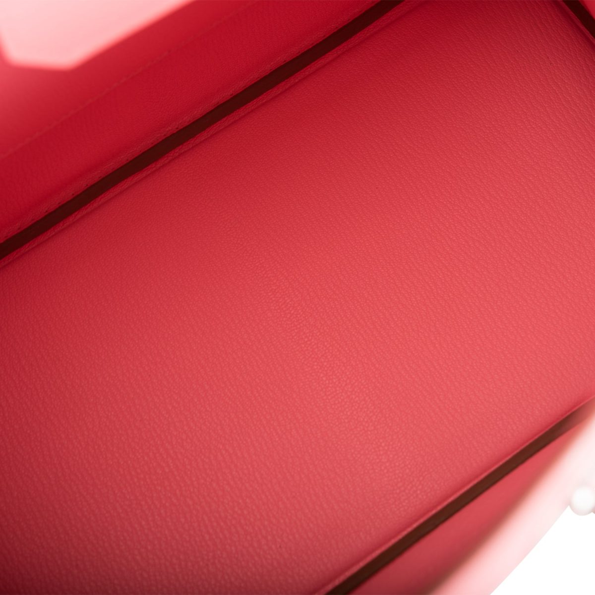 The interior is lined with Rose Confetti chevre and has a zip pocket with an Hermes engraved zipper pull and an open pocket on the opposite side.