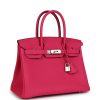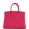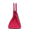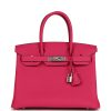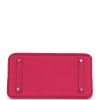 This Birkin Rose Mexico togo leather with palladium hardware and has tonal stitching, front flap, two straps with center toggle closure, clochette with lock and two keys, and double rolled handles.