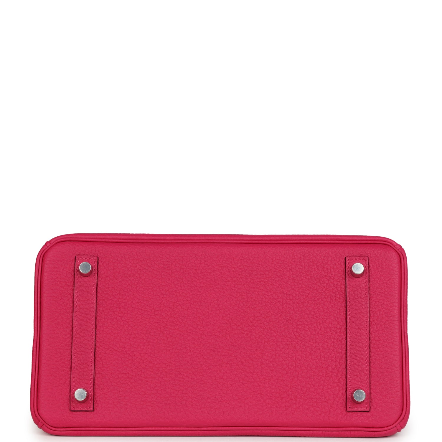 This Birkin Rose Mexico togo leather with palladium hardware and has tonal stitching, front flap, two straps with center toggle closure, clochette with lock and two keys, and double rolled handles.