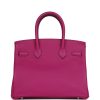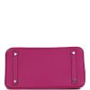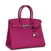 This Birkin is in Rose Pourpre togo leather with palladium hardware and has tonal stitching, front flap, two straps with center toggle closure, clochette with lock and two keys, and double rolled handles.