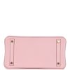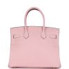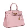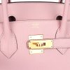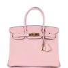 This Birkin is in Rose Sakura chevre mysore leather with gold hardware, featuring tonal stitching, front flap, two straps with center toggle closure, clochette with lock and two keys, and double rolled handles.
