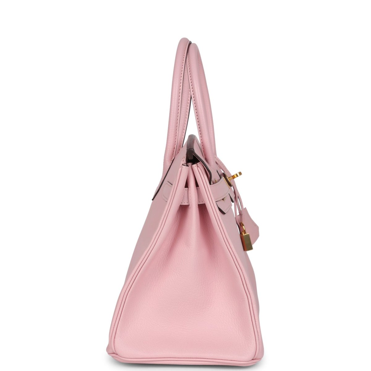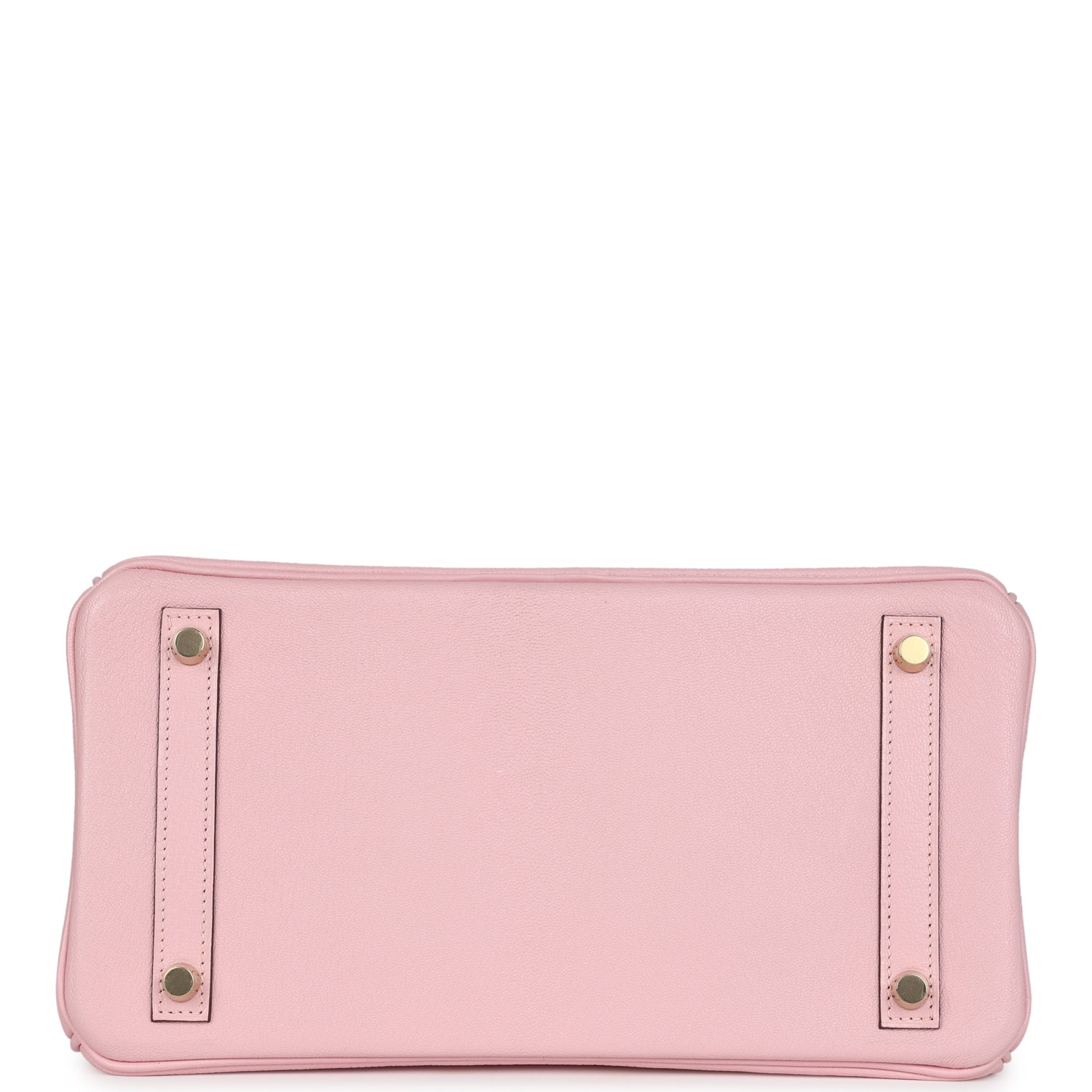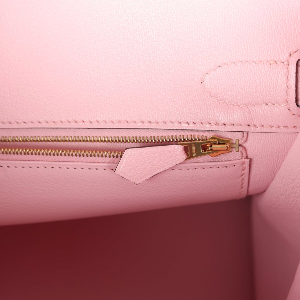 This Birkin is in Rose Sakura chevre mysore leather with gold hardware, featuring tonal stitching, front flap, two straps with center toggle closure, clochette with lock and two keys, and double rolled handles.