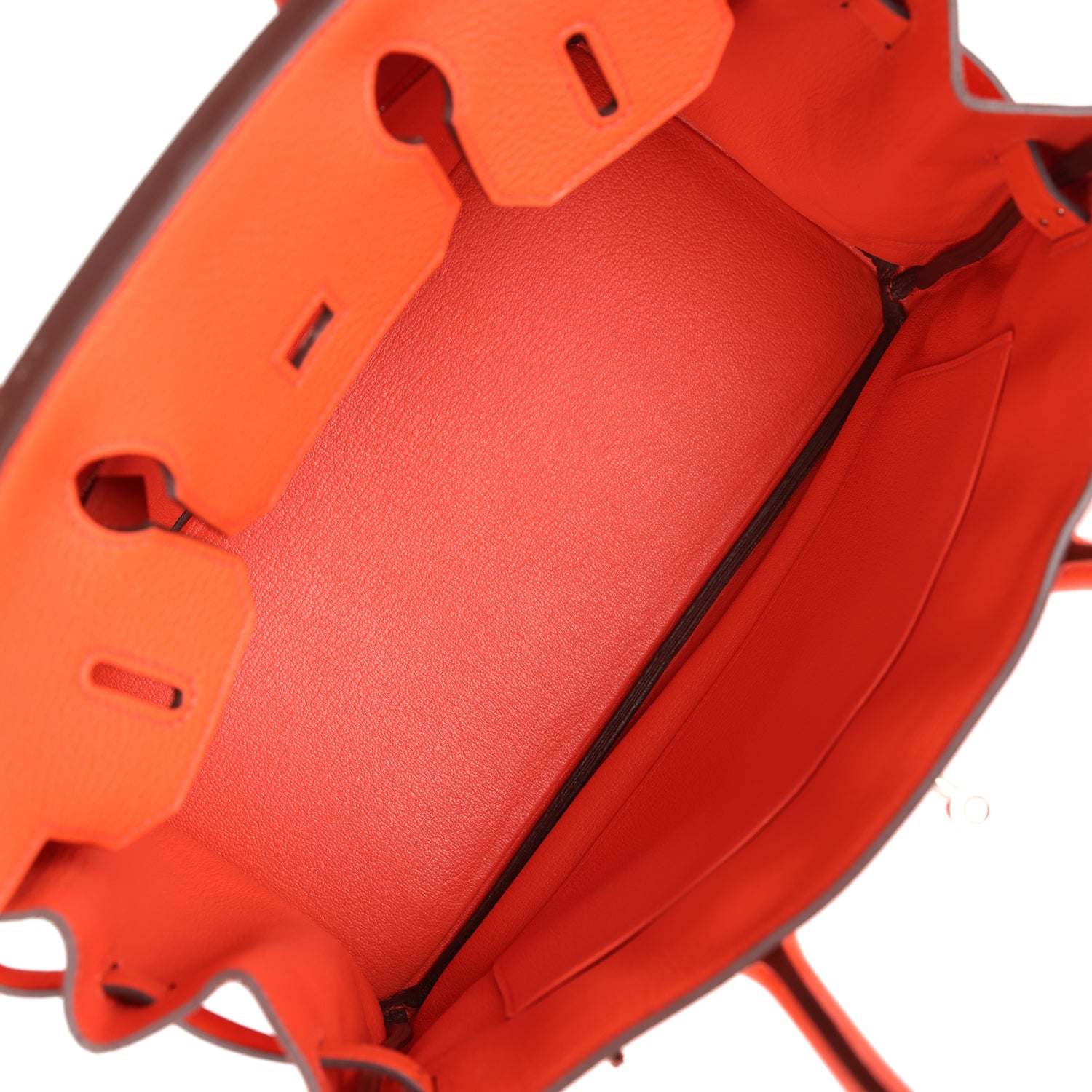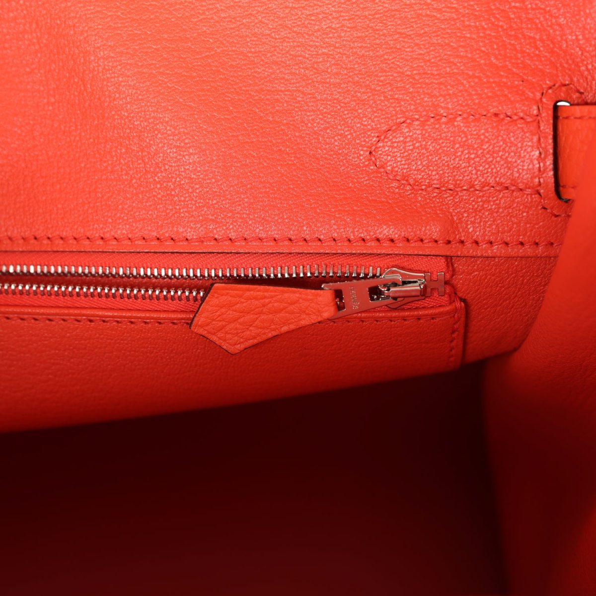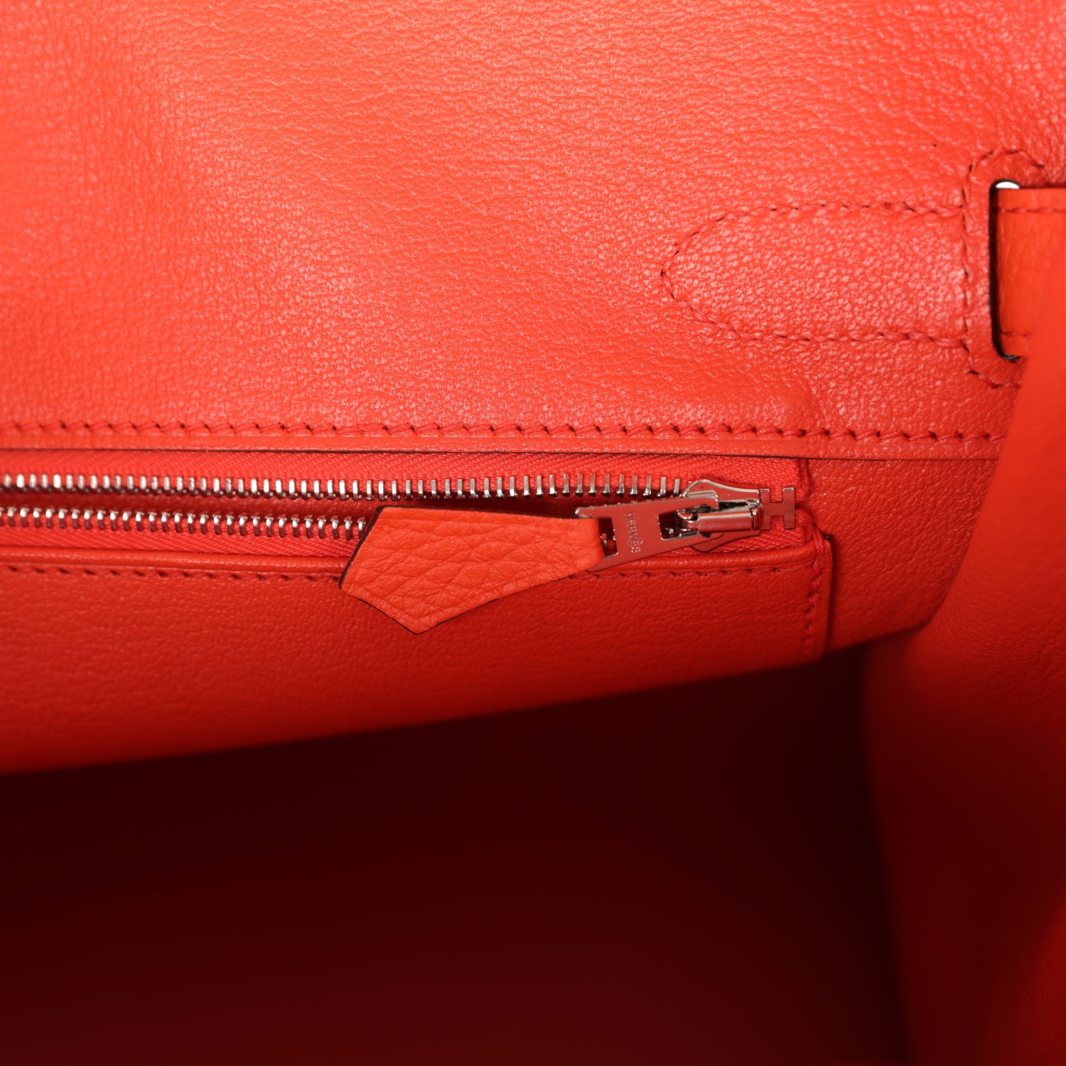 The interior is lined with Rouge Pivoine chevre and has one zip pocket with an Hermès engraved zipper pull and an open pocket on the opposite side.