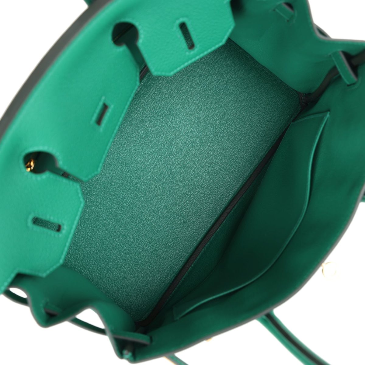 Measurements: 10" width x 7.5" height x 4.75" depth; 2.75" handle drop This Birkin is in Vert Vertigo togo leather with gold hardware and has tonal stitching, two straps with front toggle closure, clochette with lock and two keys and double rolled handles. The interior is lined with Vert Vertigo chevre and has one zip pocket with an Hermès engraved zipper pull and an open pocket on the opposite side.