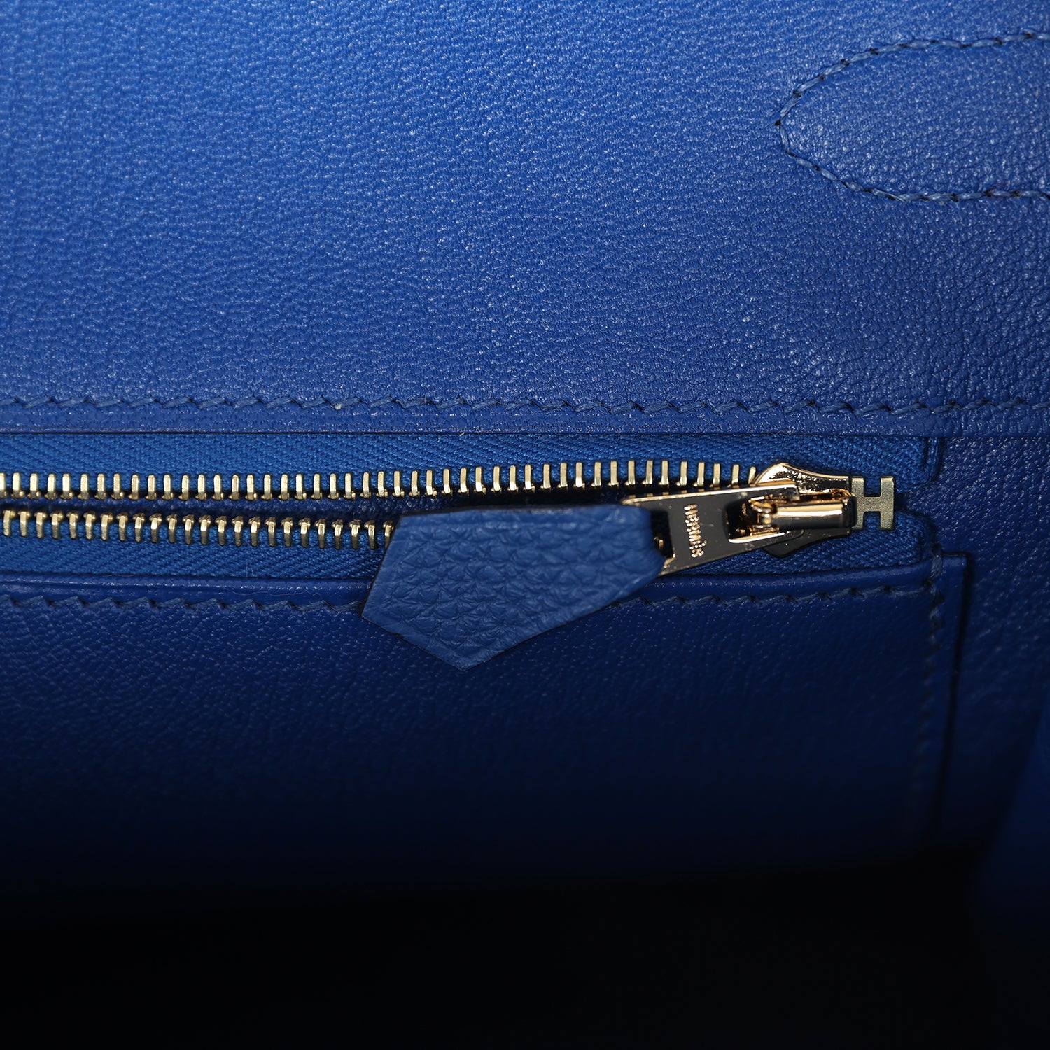 The interior is lined with Bleu France chevre and has one zip pocket with an Hermès engraved zipper pull and an open pocket on the opposite side.