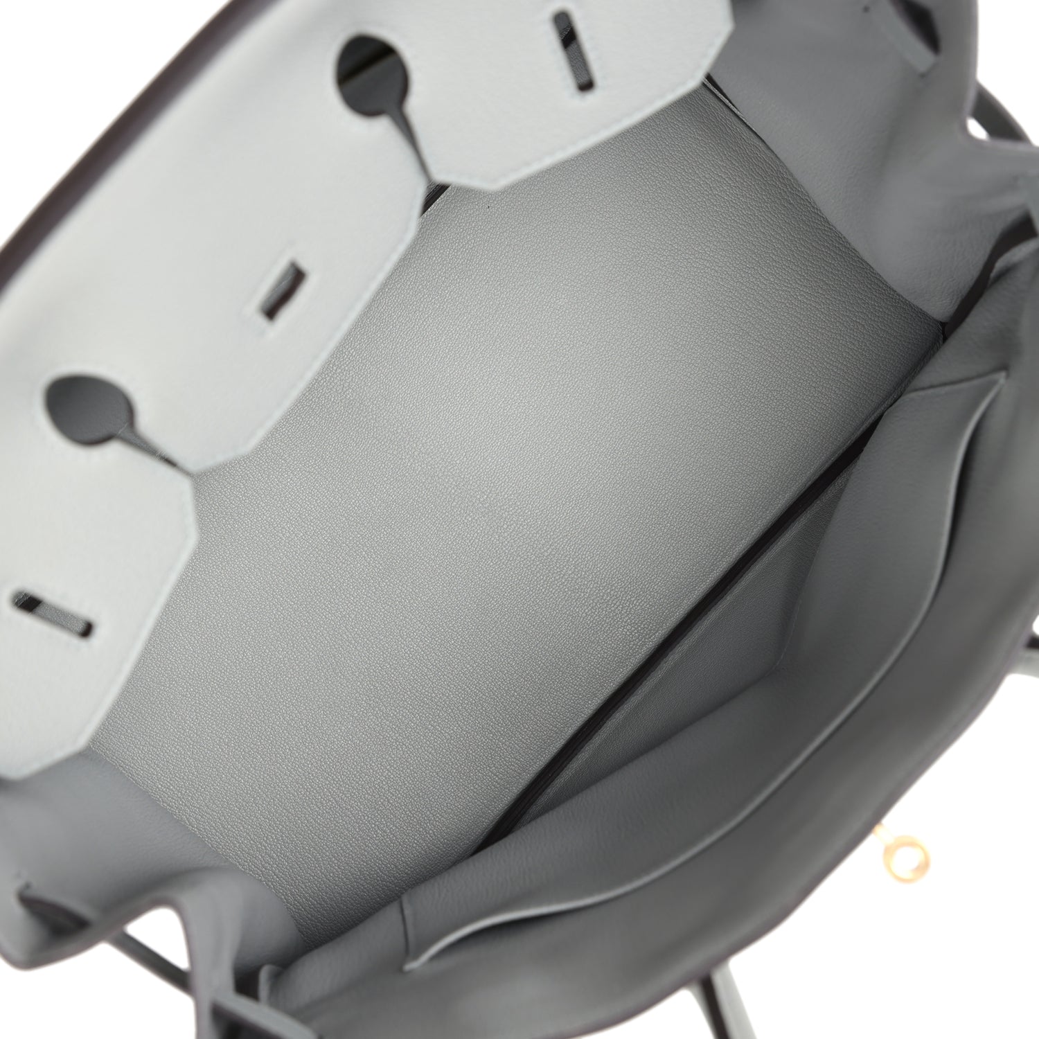 The interior is lined with Gris Mouette chevre and has one zip pocket with an Hermès engraved zipper pull and an open pocket on the opposite side.