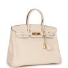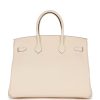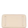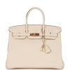 This Birkin is in Nata clemence leather with gold hardware and has tonal stitching, front flap, two straps with center toggle closure, clochette with lock and two keys, and double rolled handles.