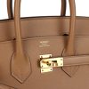This Birkin is in Chai Madame with gold hardware, has tonal stitching, front flap, two straps with center toggle closure, clochette with lock and two keys, and double rolled handles.