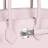 Measurements: 10" width x 7.5" height x 4.75" depth; 2.75" handle drop This Birkin, in the Sellier style, is in Mauve Pale epsom leather with palladium hardware and has tonal stitching, front flap, two straps with center toggle closure, clochette with lock and two keys, and double rolled handles. The interior is lined with Mauve Pale chevre and has one zip pocket with an Hermès engraved zipper pull and an open pocket on the opposite side.