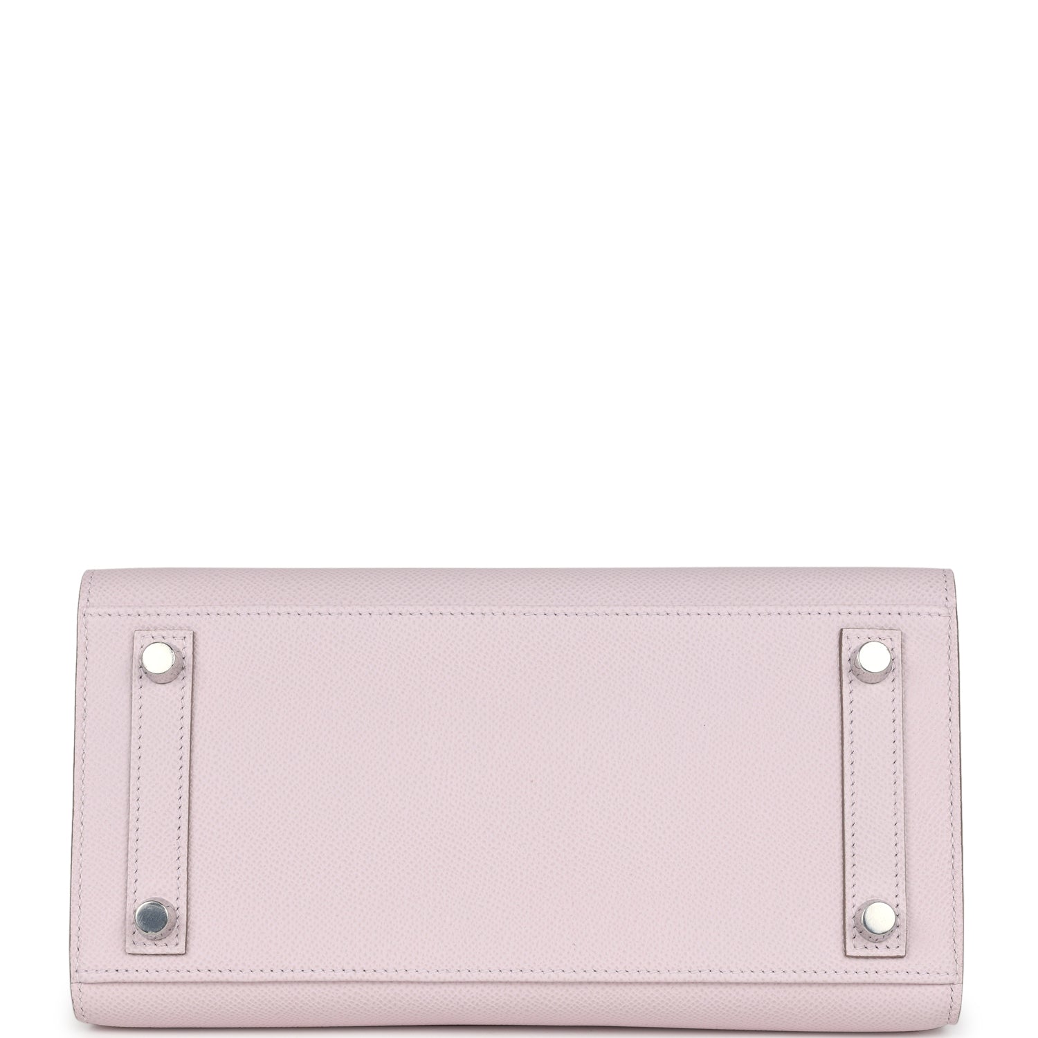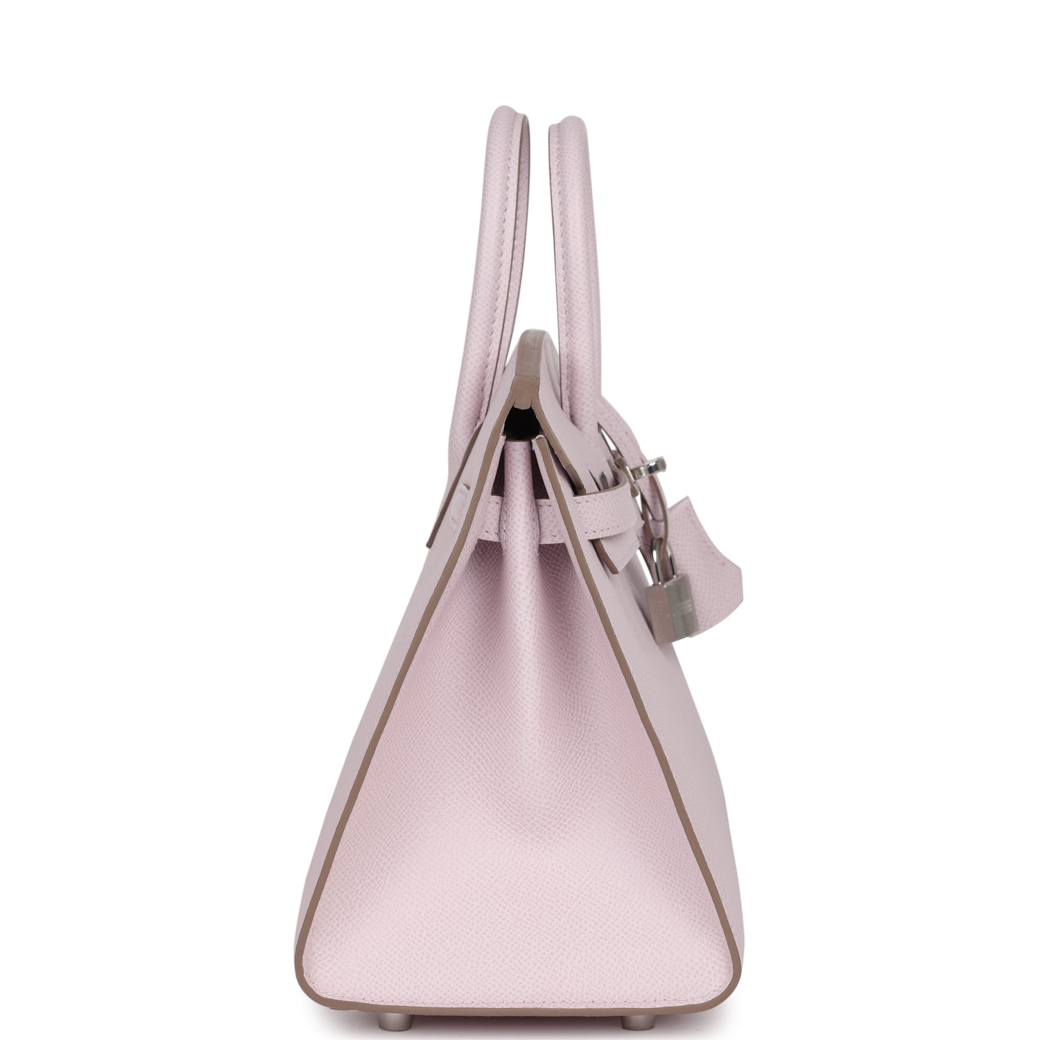Measurements: 10" width x 7.5" height x 4.75" depth; 2.75" handle drop This Birkin, in the Sellier style, is in Mauve Pale epsom leather with palladium hardware and has tonal stitching, front flap, two straps with center toggle closure, clochette with lock and two keys, and double rolled handles. The interior is lined with Mauve Pale chevre and has one zip pocket with an Hermès engraved zipper pull and an open pocket on the opposite side.