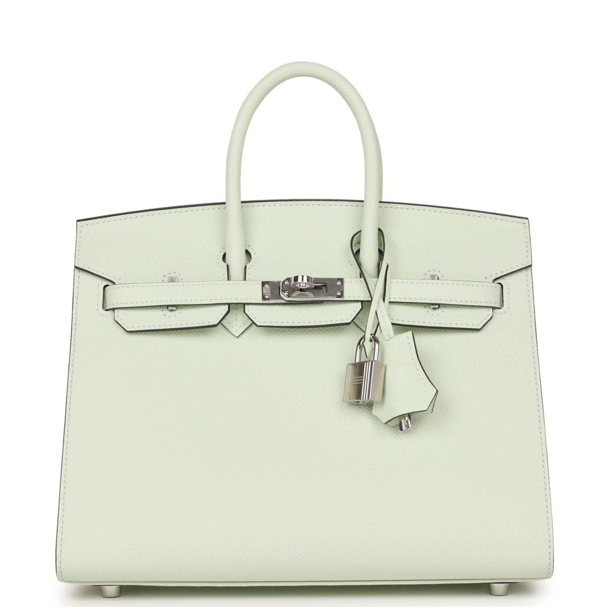 This Birkin is of Vert Fizz epsom with palladium hardware and features tonal stitching, front flap, two straps with center toggle closure, clochette with lock and two keys, and double rolled handles.