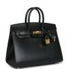 This Birkin is in Vert Fonce box calfskin leather with gold hardware and has tonal stitching, front flap, two straps with center toggle closure, clochette with lock and two keys, and double rolled handles.